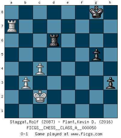 Last move : 0-1 2010 June 20 14:46:33 [Event "FICGS__CHESS__CLASS_A__000050"] [Site "FICGS"] [Date "2009.04.10"] [Round "1"] [White "Staggat,Rolf"] [Black "Plant,Kevin D."] [Result "0-1"] [WhiteElo "2087"] [BlackElo "2016"] 1.e4 c5 2.Nf3 d6 3.d4 cxd4 4.Nxd4 Nf6 5.Nc3 a6 6.Be3 e6 7.f3 b5 8.Qd2 b4 9.Nce2 e5 10.Nb3 Nc6 11.g4 Be6 12.g5 Nd7 13.Ng3 Qc7 14.f4 exf4 15.Bxf4 g6 16.O-O-O Nde5 17.h4 Rb8 18.Kb1 a5 19.Nd4 Nxd4 20.Qxd4 Be7 21.h5 O-O 22.Bh3 Bxh3 23.Rxh3 Rbc8 24.Rc1 Qc4 25.Qa7 Nc6 26.Qb7 a4 27.hxg6 fxg6 28.Bxd6 Rce8 29.b3 Qe6 30.Qxc6 axb3 31.axb3 Bxd6 32.Nf5 Be5 33.Nh6+ Kh8 34.Qxe6 Rxe6 35.Ng4 Bc3 36.Nf6 Bxf6 37.gxf6 Rxe4 38.Rf1 h5 39.c4 Re6 40.Kc2 Kh7 41.Kd3 Rd8+ 42.Kc2 Kg8 43.f7+ Kf8 44.Rhf3 Re2+ 45.Kb1 Red2 46.Kc1 Ra2 47.Rf6 Ra1+ 48.Kc2 Rxf1 49.Rxf1 Rd6 50.Ra1 Kxf7 51.Ra4 h4 52.Rxb4 h3 53.Rb7+ Kg8 54.Ra7 g5 0-1 Sicilian : Najdorf, Byrne (English) attack Queenside Castling by player White (move 16) Kingside Castling by player Black (move 21) 10 pieces endgame at move 49 : White KRPPP , Black KRPPP WHITE : King + 1 Rook 3 Pawns BLACK : King + 1 Rook 3 Pawns 9 pieces endgame at move 50 : White KRPP , Black KRPPP WHITE : King + 1 Rook 2 Pawns BLACK : King + 1 Rook 3 Pawns 8 pieces endgame at move 52 : White KRPP , Black KRPP WHITE : King + 1 Rook 2 Pawns BLACK : King + 1 Rook 2 Pawns Player Black won this chess game. Follow this game move after move (download)I have added these principles to the law: get the Knights into action before both Bishops are developed. (Emanuel Lasker) Schach ist eine Sache der genauen Beurteilung, wann man zuschlagen und wann man sich ducken muss. (Robert James Fischer) Ciertamente el estado mental actual de Bobby Fischer es una tragedia. Uno de los mas grandes jugadores de Ajedrez del mundo -el orgullo y pena del Ajedrez Americano. (Frank Brady) Même si vous avez un bon coup à faire, regardez toujours s'il n'y en a pas un qui lui soit préférable. (Pedro Damiano) All the troubles of the world come from being unable to sit alone in a quiet room. (Blaise Pascal)
