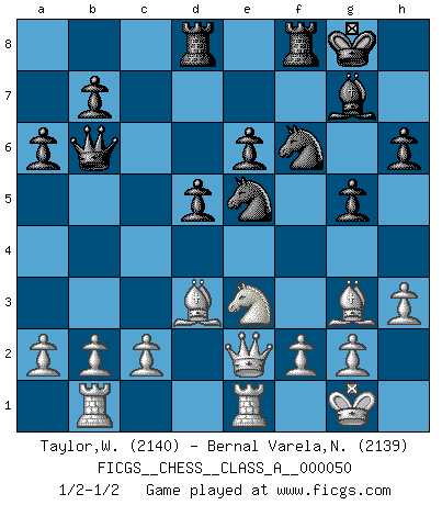 Last move : 1/2-1/2 2009 July 30 3:10:27 [Event "FICGS__CHESS__CLASS_A__000050"] [Site "FICGS"] [Date "2009.04.10"] [Round "1"] [White "Taylor,William"] [Black "Bernal Varela,Nelson"] [Result "1/2-1/2"] [WhiteElo "2140"] [BlackElo "2139"] 1.e4 c5 2.Nf3 d6 3.d4 cxd4 4.Nxd4 Nf6 5.Nc3 a6 6.Be3 Ng4 7.Bg5 h6 8.Bh4 g5 9.Bg3 Bg7 10.h3 Ne5 11.Nf5 Bxf5 12.exf5 Nbc6 13.Nd5 e6 14.fxe6 fxe6 15.Ne3 O-O 16.Be2 d5 17.O-O Qb6 18.Re1 Rad8 19.Bf1 Nd7 20.Rb1 Nc5 21.Qg4 Ne5 22.Qh5 Ncd7 23.Bd3 Nf6 24.Qe2 1/2-1/2 Sicilian : Najdorf, Byrne (English) attack Kingside Castling by player Black (move 15) Kingside Castling by player White (move 17) This chess game ended in a draw. Follow this game move after move (download)We must make sure that Chess will not be like a dead language, very interesting, but for a very small group. (Sytze Faber) Der 70jährige Viktor Kortschnoi: Die Rentenanstalt wollte mich zwingen in Rente zu gehen. Meine Frau erhält jetzt eine Pension- und ich zahle weiter in die Rentenkasse ein! (Viktor Kortschnoi) ¿Se han dado cuenta de que Fischer casi nunca ha tenido piezas malas? El las intercambia y las piezas malas se quedan con sus oponenets. (Yuri Balashov) Le plus grand jeu de l'esprit jamais inventé, plus vous l'apprenez, plus vous y prenez du plaisir. (Garry Kasparov) Games, world of games... There's always an opponent, and there's always a victim. (Revolver, movie)