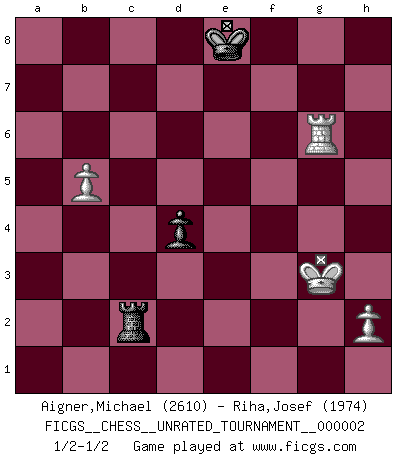 Last move : 1/2-1/2 2009 May 17 22:56:4 [Event "FICGS__CHESS__UNRATED_TOURNAMENT__000002"] [Site "FICGS"] [Date "2009.04.10"] [Round "1"] [White "Aigner,Michael"] [Black "Riha,Josef"] [Result "1/2-1/2"] [WhiteElo "2610"] [BlackElo "1974"] 1.e4 e6 2.d4 d5 3.Nc3 Bb4 4.e5 c5 5.a3 Ba5 6.Bd2 Nc6 7.Nb5 cxd4 8.Bxa5 Qxa5+ 9.b4 Qb6 10.Nd6+ Kf8 11.f4 Bd7 12.Nf3 Nge7 13.Bd3 Nc8 14.Qd2 Nxd6 15.exd6 Nd8 16.O-O Qxd6 17.Rae1 Nc6 18.b5 Ne7 19.Ne5 Be8 20.Nf3 h5 21.Kh1 Rc8 22.Nxd4 h4 23.Qe3 g6 24.a4 Rh5 25.Rf3 a6 26.Rh3 Bd7 27.g4 hxg3 28.Rxh5 g2+ 29.Kxg2 gxh5 30.Kh1 Rc3 31.Qf2 Ng6 32.Rf1 axb5 33.axb5 b6 34.f5 exf5 35.Nxf5 Bxf5 36.Qxf5 Ne5 37.Qxh5 d4 38.Qh8+ Ke7 39.Qh4+ Kd7 40.Be4 Ra3 41.Qg5 Qe7 42.Qf4 Qd6 43.Kg2 Ke8 44.Qf6 Qxf6 45.Rxf6 Re3 46.Bf5 Ng6 47.Bxg6 fxg6 48.Rxb6 Re2+ 49.Kg3 Rxc2 50.Rxg6 1/2-1/2 French : Winawer, Advance, 5.a3 Kingside Castling by player White (move 16) 10 pieces endgame at move 47 : White KRPPP , Black KRPPP WHITE : King + 1 Rook 3 Pawns BLACK : King + 1 Rook 3 Pawns 9 pieces endgame at move 48 : White KRPPP , Black KRPP WHITE : King + 1 Rook 3 Pawns BLACK : King + 1 Rook 2 Pawns 8 pieces endgame at move 49 : White KRPP , Black KRPP WHITE : King + 1 Rook 2 Pawns BLACK : King + 1 Rook 2 Pawns 7 pieces endgame at move 50 : White KRPP , Black KRP WHITE : King + 1 Rook 2 Pawns BLACK : King + 1 Rook 1 Pawn This chess game ended in a draw. Follow this game move after move (download)I feel as if I were a piece in a game of Chess, when my opponent says of it: That piece cannot be moved. (Soren Kierkegaard) Viele Opfer benötigen überhaupt keine konkrete Berechnung. Es genügt sich die entstehende Position kurz vorzustellen, um uns davon zu überzeugen, dass das Opfer korrekt ist. (Mikhail Nekhemyevich Tal) Las Aperturas te enseñan aperturas. ¡Los Finales te enseñan Ajedrez!. (Stephan Gerzadowicz) Les échecs sont un jeu par leur forme, un art par leur essence et une science par sa difficulté d'acquisition. Ils peuvent vous procurer autant de plaisir qu'un bon livre ou une belle musique, mais vous n'aurez une réelle joie que si vous arrivez à bien jouer. (Tigran Petrosian) Wikichess, chess moves explained by 'experimented' players. (Thibault de Vassal)