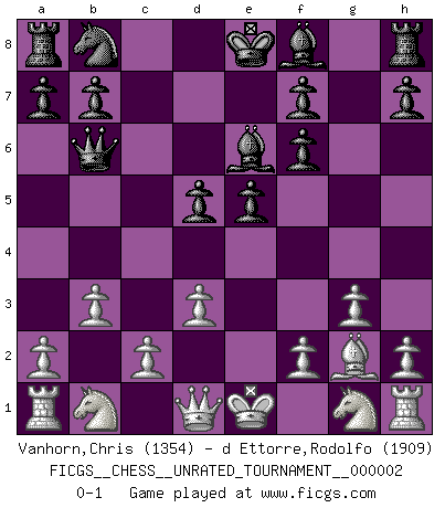 Last move : 0-1 2009 May 24 18:34:22 [Event "FICGS__CHESS__UNRATED_TOURNAMENT__000002"] [Site "FICGS"] [Date "2009.04.10"] [Round "1"] [White "Vanhorn,Chris"] [Black "d Ettorre,Rodolfo"] [Result "0-1"] [WhiteElo "1354"] [BlackElo "1909"] 1.g3 e5 2.Bg2 d5 3.d3 c6 4.e4 Nf6 5.Bg5 Qb6 6.Bxf6 gxf6 7.exd5 cxd5 8.b3 Be6 0-1 This chess game has been lost on time (started : 2009.04.10 23:1:38) Benko's Opening Player Black won this chess game. Follow this game move after move (download)Chess is a sea in which a gnat may drink and an elephant may bathe. (Hindu proverb) Sicherlich können nur Meister einen Stil haben. Daß ein nicht-Meister auch nur ein einziges Mal in seinem Leben eine Partie folgerecht durchführte, habe ich niemals bemerkt. (Emanuel Lasker) Personalmente, yo prefiero mirar hacia el futuro en donde un programa de computadora gane el título mundial de Ajedrez. La humanidad necesita una lección de humildad. (Richard Dawkings) Je ne crois pas en la psychologie, je crois aux bons coups. (Robert Fischer) Before all elsed, be armed. (Niccolo Machiavelli)