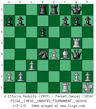 Last move : 1/2-1/2 2009 May 6 17:19:37 [Event "FICGS__CHESS__UNRATED_TOURNAMENT__000002"] [Site "FICGS"] [Date "2009.04.10"] [Round "1"] [White "d Ettorre,Rodolfo"] [Black "Parmet,Daniel"] [Result "1/2-1/2"] [WhiteElo "1909"] [BlackElo "1814"] 1.e4 e5 2.Nf3 Nc6 3.d4 exd4 4.Nxd4 Bc5 5.Be3 Qf6 6.c3 Nge7 7.Bc4 Ne5 8.Be2 Qg6 9.O-O d6 10.f3 O-O 11.Nd2 d5 12.Kh1 dxe4 13.fxe4 Bg4 14.Bf4 Bxe2 15.Qxe2 Bd6 16.Nb5 N7c6 17.Rad1 Rad8 18.Nf3 Rfe8 19.Nxd6 cxd6 20.Rd5 Ng4 21.Rg5 Qe6 22.Nd4 Nxd4 23.Qxg4 Qxg4 1/2-1/2 Scotch game Kingside Castling by player White (move 9) Kingside Castling by player Black (move 10) This chess game ended in a draw. Follow this game move after move (download)When you don't know what to do, wait for your opponent to get an idea - it's sure to be wrong. (Tarrasch) Es ist peinlich, dass ich nie Weltmeister wurde. Es wäre leicht, Leonid Breschnjew als Ursache vorzuschieben, dessen Apparat den Vorzeigekommunisten Anatoli Karpow in allem unterstützte. Aber Garri Kasparow zum Beispiel, der ebenfalls von den Sowjets unerwünscht war, hat trotz der Widerstände den WM-Titel erobert. (Viktor Kortschnoi) No todos los artistas son jugadores de Ajedrez, pero todos los jugadores de Ajedrez son artistas. (Marcel Duchamp) Un millionnaire : 'Monsieur Steinitz ! Vous ne participez aux tournois que pour l'argent, alors que moi je n'y viens que pour l'honneur.' Steinitz : 'Chacun joue pour ce qu'il n'a pas'... If you work for a living, why do you kill yourself working ? (Tuco to a chicken in The Good, The Bad and The Ugly)