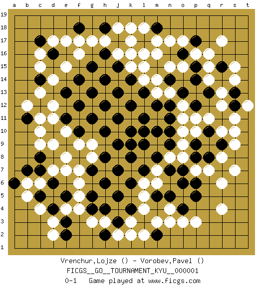 Last move : 0-1 2007 February 2 9:5:57 [Event "FICGS__GO__TOURNAMENT_KYU__000001"] [Site "FICGS"] [Date "2006.09.08"] [Round "1"] [Black "Vrenchur,Lojze"] [White "Vorobev,Pavel"] [Result "0-1"] 1.d4 q16 2.m10 d17 3.q10 r4 4.k10 c15 5.d16 r6 6.d10 c16 7.c17 e17 8.f14 d7 9.h12 c6 10.k16 e15 11.k4 g3 12.g7 f4 13.e5 n3 14.g13 c4 15.k9 e7 16.j11 f6 17.j9 g9 18.h8 c13 19.l10 d12 20.h10 g17 21.h14 n17 22.e11 r12 23.g15 q14 24.j7 o10 25.h6 l5 26.k8 r8 27.c14 r17 28.f12 o12 29.g11 j2 30.k6 f7 31.j13 o8 32.o13 k2 33.j5 d14 34.e13 c10 35.k12 s10 36.l11 d9 37.f10 n13 38.e9 l18 39.l7 k18 40.h4 f5 41.j15 m6 42.k14 e8 43.g5 f9 44.c8 c9 45.h16 m16 46.l13 l4 47.j17 j18 48.m12 m14 49.f8 g8 50.l15 d11 51.j3 e10 52.n11 o11 53.d6 f16 54.f18 f17 55.h18 h17 56.c5 b6 57.l9 b5 58.m8 m7 59.n9 o9 60.n7 n8 61.m18 m17 62.l17 k17 63.m15 n15 64.o16 o17 65.p17 p16 66.p15 q15 67.q13 r13 68.p12 q11 69.p14 l16 70.e3 e4 71.n14 o15 72.o7 d3 73.e2 d2 74.c7 j16 75.h2 h3 76.l3 k3 77.b11 b12 78.c12 c11 79.p9 p7 80.p8 p10 81.o6 k15 82.p5 p3 83.o4 o3 84.n5 m3 85.m2 l2 86.b7 k16 87.q8 q7 88.r7 s7 89.r9 s9 90.p6 n4 91.m5 l6 92.s13 s14 93.r15 s15 94.r11 s11 95.s12 t12 96.a6 l14 97.m15 r10 98.n10 m13 99.n12 l15 100.g4 p11 0-1 Here are the names of the openings (joseki) played in the four corners : Corner d4 : d4 d7 Hoshi (Hwajeom, Seongjeom, Xingwei`) 4-4 Point. The star or hoshi (4-4) point, emphasizing influence at the potential expense of territory. Nikken Takagakari (Dukan Nop'dakeolch'im, E`r Gaojia, 2-Space High Approach). White 2 is a light approach move. Rarely played in even games, White 2 is typically employed in handicap games. Black continues with 6-4 or 3-10. In Korean Sunjang Baduk Black has a stone on 8-4. Player White won this Go (weiqi, baduk) game. Follow this game move after move (download)Territory really exists only in the end. (Pierre Audouard) Those who make the worst use of their time are the first to complain of its brevity. (Jean de la Bruyere)