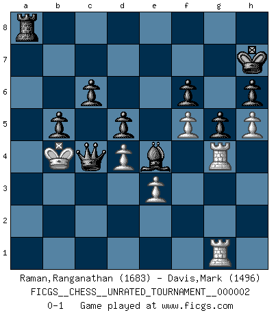 Last move : 0-1 2009 May 20 6:1:57 [Event "FICGS__CHESS__UNRATED_TOURNAMENT__000002"] [Site "FICGS"] [Date "2009.04.10"] [Round "1"] [White "Raman,Ranganathan"] [Black "Davis,Mark"] [Result "0-1"] [WhiteElo "1683"] [BlackElo "1496"] 1.c3 d5 2.e3 e5 3.Qh5 Nc6 4.Bb5 Nf6 5.Qe2 Bd7 6.d4 e4 7.h3 Be7 8.Nd2 O-O 9.a3 Re8 10.b4 a6 11.Ba4 b5 12.Bc2 Bf5 13.g4 Bg6 14.Bb2 Bf8 15.Nb3 h6 16.f4 exf3 17.Nxf3 Bxc2 18.Nbd2 Ne4 19.Nxe4 Bxe4 20.Rf1 Bd6 21.Kd2 Qd7 22.Rf2 Ne7 23.Raf1 Bg3 24.Rg2 Bd6 25.R2g1 Ng6 26.Qf2 c6 27.h4 Qc7 28.h5 Ne7 29.Nh4 Rf8 30.Nf5 Nxf5 31.gxf5 Rae8 32.Rg4 Rd8 33.Rfg1 g5 34.Rh4 Kh7 35.Rh3 f6 36.Ke1 Rg8 37.Bc1 a5 38.Rg4 axb4 39.cxb4 Ra8 40.Qa2 Bxb4+ 41.Ke2 Bxa3 42.Bd2 Bc1 43.Qb3 Bxd2 44.Kxd2 Ra4 45.Rhg3 Rga8 46.Rg1 Qh2+ 47.Kc3 Ra3 48.Kb4 Rxb3+ 49.Kxb3 Qc2+ 50.Kb4 Qc4+ 0-1 Saragossa Opening Kingside Castling by player Black (move 8) Player Black won this chess game. Follow this game move after move (download)The isolated Pawn casts gloom over the entire chessboard. (Aaron Nimzovich) Ich verstehe Aljechins Kombinationen ganz gut; aber woher er diese Angriffschancen bekommt und wie er die Eröffnung behandelt das ist für mich ein Buch mit sieben Siegeln. (Rudolf Spielmann) Observen a Garry Kasparov. Después de una derrota, invariablemente el gana la próxima partida. Prácticamente hace pedazos a su siguiente oponente. Eso es algo que tenemos que aprender a lograr. (Maurice Ashley) Le plus grand jeu de l'esprit jamais inventé, plus vous l'apprenez, plus vous y prenez du plaisir. (Garry Kasparov) Thibault, I ask for draw. Game 13876. - Sorry Ilmars, you won. (FICGS chat)