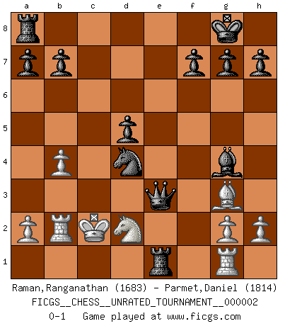 Last move : 0-1 2009 April 13 21:59:15 [Event "FICGS__CHESS__UNRATED_TOURNAMENT__000002"] [Site "FICGS"] [Date "2009.04.10"] [Round "1"] [White "Raman,Ranganathan"] [Black "Parmet,Daniel"] [Result "0-1"] [WhiteElo "1683"] [BlackElo "1814"] 1.d4 d5 2.Bf4 Nf6 3.f3 c5 4.dxc5 Nc6 5.e3 e5 6.Bg3 Bxc5 7.Qd2 Qb6 8.c3 Bxe3 9.Qe2 Bxg1 10.b4 O-O 11.Nd2 Re8 12.Rb1 e4 13.fxe4 Nxe4 14.Kd1 Nxc3+ 15.Kc1 Nxe2+ 16.Bxe2 Rxe2 17.Kd1 Qe3 18.Rb2 Bg4 19.Rxg1 Re1+ 20.Kc2 Nd4+ 0-1 Queen's pawn, Mason variation Kingside Castling by player Black (move 10) Player Black won this chess game. Follow this game move after move (download)Bobby Fischer is the greatest Chess player who has ever lived. (Ken Smith) Ich würde mich als ganz normalen Jungen bezeichnen [Im Alter von 12]. (Sergej Karjakin) El Ajedrez expande y enriquece tu mente. (Saudin Robovic) Celui qui prend des risques peut perdre, celui qui n'en prend pas perd toujours. (Xavier Tartacover) A good programmer is someone who always looks both ways before crossing a one-way street. (Doug Linder)