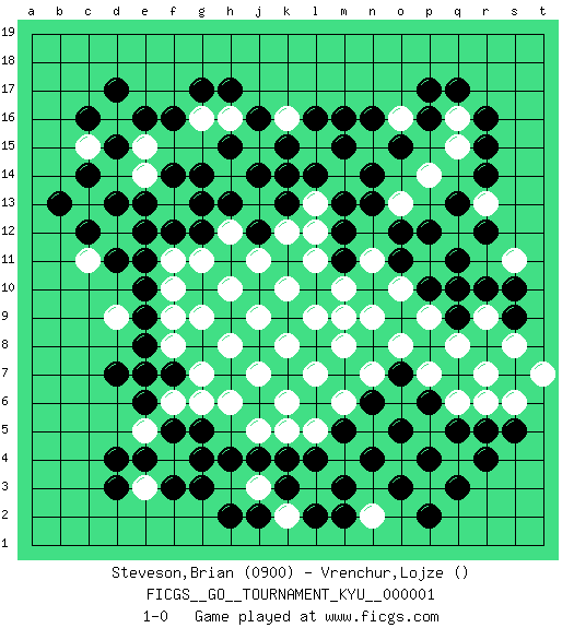Last move : 1-0 2007 February 2 9:6:25 [Event "FICGS__GO__TOURNAMENT_KYU__000001"] [Site "FICGS"] [Date "2006.09.08"] [Round "1"] [Black "Steveson,Brian"] [White "Vrenchur,Lojze"] [Result "1-0"] [Rating 1 "0900"] 1.d17 m9 2.q3 q16 3.d4 k10 4.d11 q4 5.r4 m8 6.q5 g4 7.q9 d16 8.c16 l9 9.d7 d9 10.c14 h12 11.r12 p5 12.p4 q6 13.f16 r13 14.q13 e15 15.j16 q12 16.q11 p11 17.p12 k8 18.m16 q10 19.r10 l7 20.e13 s11 21.p10 h16 22.h17 q8 23.n4 j9 24.k4 p7 25.p17 r7 26.r14 o6 27.f3 j7 28.r16 n7 29.g13 q15 30.r15 o8 31.o15 n9 32.h13 o4 33.o3 m6 34.g3 h8 35.q17 n5 36.o12 j11 37.m12 n12 38.n13 p9 39.e10 h10 40.e9 k12 41.h4 p3 42.p2 l11 43.k14 m10 44.k13 j13 45.j14 h14 46.g14 k6 47.g12 f13 48.f14 e14 49.e12 f11 50.f12 l13 51.l14 m14 52.m13 g9 53.f7 g7 54.g5 h6 55.s5 r6 56.r5 l5 57.l4 m4 58.o5 o10 59.o11 n11 60.m3 n2 61.m2 j5 62.j4 l3 63.k3 k2 64.l2 f8 65.e8 e7 66.e6 e5 67.f5 f4 68.e4 j3 69.j2 s8 70.s9 r9 71.q10 d12 72.d13 n15 73.m15 g11 74.e16 c15 75.d15 f10 76.e11 c11 77.c12 c13 78.b13 t7 79.s10 j15 80.h15 s6 81.m5 g6 82.n6 o16 83.n16 k16 84.k15 l15 85.l16 o13 86.n14 f4 87.g4 e3 88.d3 h3 89.h2 f9 90.p6 f6 91.e7 j3 92.o7 l12 93.m11 k5 94.j12 g16 95.g17 p14 96.n10 n11 97.p16 1-0 Here are the names of the openings (joseki) played in the four corners : Corner q4 : m9 q3 This joseki is unknown. A weak or weird move has probably been played in this corner. Corner d4 : d4 g4 Hoshi (Hwajeom, Seongjeom, Xingwei`) 4-4 Point. The star or hoshi (4-4) point, emphasizing influence at the potential expense of territory. Nikken Takagakari (Dukan Nop'dakeolch'im, E`r Gaojia, 2-Space High Approach). White 2 is a light approach move. Rarely played in even games, White 2 is typically employed in handicap games. Black continues with 6-4 or 3-10. In Korean Sunjang Baduk Black has a stone on 8-4. Corner q16 : q16 r12 Hoshi (Hwajeom, Seongjeom, Xingwei`) 4-4 Point. The star or hoshi (4-4) point, emphasizing influence at the potential expense of territory. Player Black won this Go (weiqi, baduk) game. Follow this game move after move (download)... {it is} something unearthly... if there are sentient beings on other planets, then they play go. (Emanuel Lasker, chess world champion) Information on the Internet is subject to the same rules and regulations as conversation at a bar. (George Lundberg)