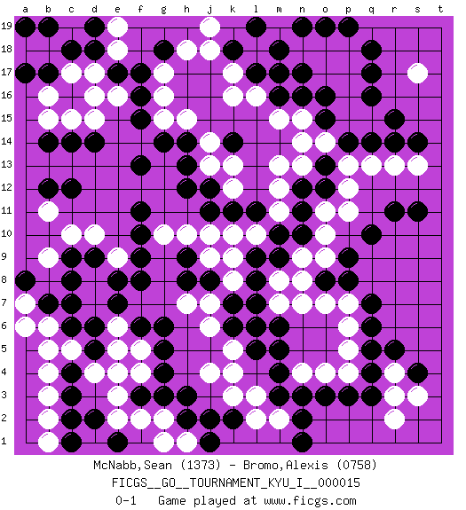 Last move : 0-1 2009 October 25 19:29:40 [Event "FICGS__GO__TOURNAMENT_KYU_I__000015"] [Site "FICGS"] [Date "2009.04.11"] [Round "1"] [Black "McNabb,Sean"] [White "Bromo,Alexis"] [Result "0-1"] [Rating 1 "1373"] [Rating 2 "0758"] 1.q16 d4 2.q4 d16 3.f17 k16 4.f15 g16 5.f16 e16 6.d14 d15 7.c14 c15 8.b14 b15 9.d18 e18 10.e17 d17 11.c18 b18 12.b17 a18 13.a17 c17 14.b19 c19 15.d19 e19 16.a19 b16 17.c6 c5 18.d6 b6 19.b7 b5 20.c8 d10 21.f10 e9 22.f6 k4 23.q10 k10 24.f9 g15 25.f13 g17 26.g18 h18 27.f3 f4 28.g4 e4 29.g5 e3 30.h3 j4 31.n3 n7 32.q7 n13 33.n16 q15 34.r15 p16 35.q14 p15 36.q17 p17 37.q18 p18 38.r14 p5 39.q5 p4 40.p3 o4 41.o3 q13 42.p14 o14 43.o15 n15 44.o16 o17 45.n17 n18 46.p19 o18 47.m18 m17 48.m16 m15 49.l17 l16 50.m17 k17 51.n19 p13 52.m5 l18 53.o19 r13 54.l7 n4 55.m4 p6 56.q6 p7 57.p8 o7 58.o8 n8 59.l9 n9 60.j8 j9 61.h8 o9 62.p9 o10 63.m10 m11 64.l11 l10 65.m9 m8 66.l8 k9 67.n11 m12 68.n10 o11 69.n12 m13 70.o12 p11 71.o13 n14 72.r11 k8 73.k7 j7 74.l5 k5 75.h9 h10 76.h13 l6 77.m6 m7 78.k6 j6 79.m3 p12 80.l6 h7 81.f8 d8 82.c9 c10 83.e7 d7 84.c12 f2 85.g3 g2 86.h2 e2 87.k18 j18 88.l19 j19 89.g14 l3 90.k2 l2 91.n1 m2 92.n2 k3 93.j2 h1 94.k11 j10 95.j12 k13 96.k14 k12 97.j11 j13 98.h12 j14 99.h14 h15 100.j1 g1 101.d5 f5 102.g6 e6 103.e8 e5 104.c7 a7 105.a8 a6 106.c3 b2 107.c4 b4 108.c2 b3 109.e1 d1 110.d2 b1 111.c1 b9 112.d9 b11 113.b12 g10 114.f11 s17 115.s14 s13 116.s11 r2 117.s4 r3 118.q3 r4 119.r5 s3 0-1 Here are the names of the openings (joseki) played in the four corners : Corner d16 : d16 f17 Hoshi (Hwajeom, Seongjeom, Xingwei`) 4-4 Point. The star or hoshi (4-4) point, emphasizing influence at the potential expense of territory. Ikken Kakari (Hankan Keolch'im, Yi Gua`jiao~, 1-Space Low Approach). Black 2 is the standard approach move to the 4-4. Corner d4 : d4 c6 Hoshi (Hwajeom, Seongjeom, Xingwei`) 4-4 Point. The star or hoshi (4-4) point, emphasizing influence at the potential expense of territory. Ikken Kakari (Hankan Keolch'im, Yi Gua`jiao~, 1-Space Low Approach). Black 2 is the standard approach move to the 4-4. Corner q16 : q16 n13 Hoshi (Hwajeom, Seongjeom, Xingwei`) 4-4 Point. The star or hoshi (4-4) point, emphasizing influence at the potential expense of territory. Player White won this Go (weiqi, baduk) game. Follow this game move after move (download)Five liberties for tactical stability. (Anonymous) Perseverance does not equal worthiness. Next time you want to get my attention, wear something fun. Low-riding jeans are hot. (Gregory House, House M.D.)