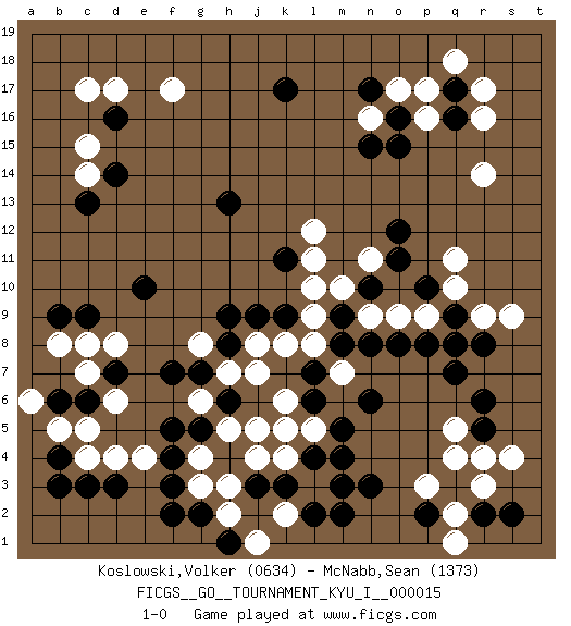 Last move : 1-0 2009 October 12 20:58:9 [Event "FICGS__GO__TOURNAMENT_KYU_I__000015"] [Site "FICGS"] [Date "2009.04.11"] [Round "1"] [Black "Koslowski,Volker"] [White "McNabb,Sean"] [Result "1-0"] [Rating 1 "0634"] [Rating 2 "1373"] 1.d16 q4 2.q16 d4 3.c6 c8 4.c3 c4 5.d3 e4 6.b4 b5 7.b3 c5 8.f3 r14 9.l7 f17 10.o12 o17 11.k17 c14 12.h13 c17 13.q7 r17 14.q17 r16 15.f7 d6 16.n3 r9 17.o16 n16 18.n15 p16 19.o15 p17 20.r5 r4 21.e10 q5 22.d14 d17 23.n17 q18 24.c13 c15 25.q9 q10 26.p10 q11 27.b9 b8 28.f4 l3 29.m4 h3 30.l4 k4 31.l2 k2 32.m2 h5 33.f5 k6 34.d7 c7 35.l6 h7 36.r8 s9 37.r2 q2 38.r6 s4 39.k5 j5 40.h8 j8 41.j9 g8 42.h9 j7 43.g7 l5 44.m5 k5 45.g2 h2 46.p2 q1 47.c9 d8 48.n6 p9 49.h6 g6 50.p8 o9 51.g5 g3 52.f2 g4 53.h1 j1 54.j3 j4 55.k3 k8 56.k9 l8 57.n8 m7 58.m8 l9 59.q3 r3 60.n10 n9 61.m9 l10 62.q8 l12 63.k11 l11 64.b6 a6 65.s2 p3 66.m3 m10 67.o8 n11 68.o11 1-0 This go game has been lost on time (started : 2009.04.11 12:12:2) Here are the names of the openings (joseki) played in the four corners : Corner d4 : d4 c6 Hoshi (Hwajeom, Seongjeom, Xingwei`) 4-4 Point. The star or hoshi (4-4) point, emphasizing influence at the potential expense of territory. Ikken Kakari (Hankan Keolch'im, Yi Gua`jiao~, 1-Space Low Approach). Black 2 is the standard approach move to the 4-4. Corner q16 : q16 r14 Hoshi (Hwajeom, Seongjeom, Xingwei`) 4-4 Point. The star or hoshi (4-4) point, emphasizing influence at the potential expense of territory. Ikken Kakari (Hankan Keolch'im, Yi Gua`jiao~, 1-Space Low Approach). White 2 is the standard approach move to the 4-4. Corner q4 : q4 l7 Hoshi (Hwajeom, Seongjeom, Xingwei`) 4-4 Point. The star or hoshi (4-4) point, emphasizing influence at the potential expense of territory. Corner d16 : d16 f17 Hoshi (Hwajeom, Seongjeom, Xingwei`) 4-4 Point. The star or hoshi (4-4) point, emphasizing influence at the potential expense of territory. Ikken Kakari (Hankan Keolch'im, Yi Gua`jiao~, 1-Space Low Approach). White 2 is the standard approach move to the 4-4. Player Black won this Go (weiqi, baduk) game. Follow this game move after move (download)When in doubt, remove the enemy stones from the board. (Bill Taylor) A generalist learns less and less about more and more until he knows nothing about everything. (Author unknown)
