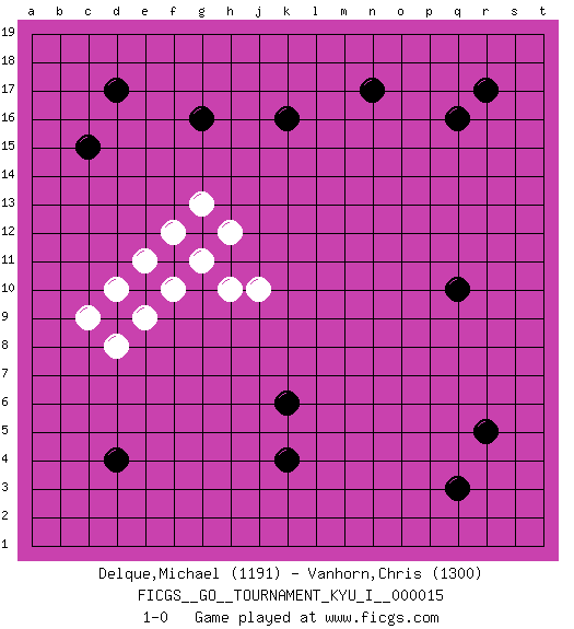 Last move : 1-0 2009 May 25 18:35:41 [Event "FICGS__GO__TOURNAMENT_KYU_I__000015"] [Site "FICGS"] [Date "2009.04.11"] [Round "1"] [Black "Delque,Michael"] [White "Vanhorn,Chris"] [Result "1-0"] [Rating 1 "1191"] [Rating 2 "1300"] 1.q3 j10 2.d4 d10 3.d17 d8 4.c15 e9 5.k16 c9 6.r5 e11 7.k4 f10 8.q16 f12 9.q10 g11 10.k6 h10 11.r17 g13 12.g16 h12 13.n17 1-0 This go game has been lost on time (started : 2009.04.11 12:12:2) Here are the names of the openings (joseki) played in the four corners : Corner d4 : d4 d8 Hoshi (Hwajeom, Seongjeom, Xingwei`) 4-4 Point. The star or hoshi (4-4) point, emphasizing influence at the potential expense of territory. Player Black won this Go (weiqi, baduk) game. Follow this game move after move (download)The carpenter's square becomes ko. (Anonymous) The best weapon against an enemy is another enemy. (Friedrich Nietzsche)