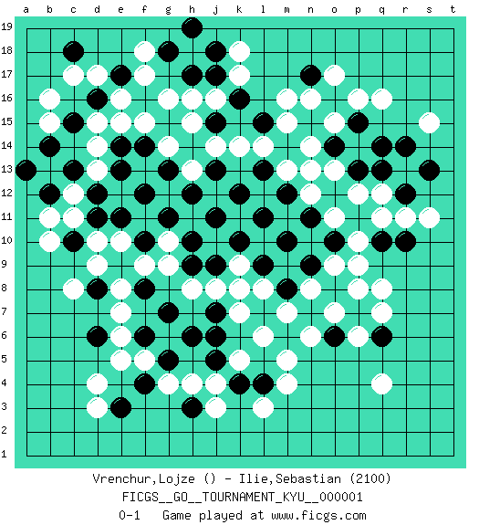 Last move : 0-1 2007 February 2 9:5:33 [Event "FICGS__GO__TOURNAMENT_KYU__000001"] [Site "FICGS"] [Date "2006.09.08"] [Round "1"] [Black "Vrenchur,Lojze"] [White "Ilie,Sebastian"] [Result "0-1"] [Rating 2 "2100"] 1.k4 q16 2.d16 d4 3.k10 q4 4.q10 d10 5.k16 q12 6.k12 q8 7.o8 p9 8.o10 p10 9.d12 d14 10.p11 q11 11.f14 e15 12.h12 e16 13.n9 m4 14.m8 m16 15.g13 h16 16.h10 h4 17.n7 k5 18.e13 c12 19.l11 p12 20.j11 k17 21.f12 f9 22.g11 h8 23.e11 m13 24.j9 j8 25.l9 p6 26.m10 k14 27.k8 k7 28.l7 l6 29.j13 j14 30.h14 h15 31.g15 g16 32.f10 g9 33.m6 m5 34.l4 j4 35.n11 n6 36.m12 n13 37.l13 l14 38.j6 m7 39.o12 o13 40.p7 q7 41.q6 p8 42.o6 o7 43.f16 f15 44.m14 n8 45.p13 o9 46.r12 r11 47.h3 j3 48.l15 m15 49.h17 g14 50.j15 h13 51.c13 c11 52.e9 e10 53.j7 l8 54.h6 k9 55.q13 k8 56.q14 o11 57.r14 n12 58.s13 s15 59.j5 l3 60.g5 g4 61.r10 s11 62.o14 n14 63.p15 p16 64.o16 o17 65.n15 n16 66.n17 o15 67.e17 f17 68.j17 j16 69.c15 d17 70.c18 c17 71.g7 e7 72.f6 e5 73.f4 f5 74.f8 e8 75.d8 d9 76.e3 d3 77.d6 e6 78.g18 f18 79.j18 k18 80.h19 d13 81.b14 b16 82.b12 b11 83.e14 d15 84.d11 c8 85.c10 b10 86.a13 b15 87.h9 g10 0-1 Here are the names of the openings (joseki) played in the four corners : Player White won this Go (weiqi, baduk) game. Follow this game move after move (download)In the opening, when you don't know what to play, make a shimari. (Jansteen) It is not true that people stop pursuing dreams because they grow old, they grow old because they stop pursuing dreams. (Gabriel Garcia Marquez)