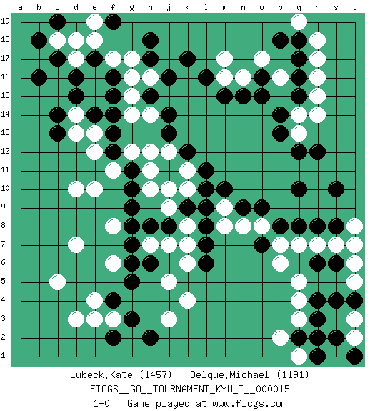 Last move : 1-0 2009 September 22 9:23:34 [Event "FICGS__GO__TOURNAMENT_KYU_I__000015"] [Site "FICGS"] [Date "2009.04.11"] [Round "1"] [Black "Lubeck,Kate"] [White "Delque,Michael"] [Result "1-0"] [Rating 1 "1457"] [Rating 2 "1191"] 1.q16 d3 2.d16 q4 3.k17 c5 4.q10 k4 5.c14 d10 6.r6 p6 7.p8 q7 8.r8 r7 9.q8 s7 10.s8 p7 11.r3 q3 12.r4 q5 13.q2 p2 14.s6 t7 15.r2 t6 16.s4 t5 17.t4 q1 18.r1 t2 19.s2 t3 20.t1 o8 21.o9 n8 22.n9 m8 23.l10 r14 24.r12 r17 25.q17 r16 26.q15 r15 27.p13 q13 28.q12 q14 29.p14 o17 30.q18 r18 31.o16 m17 32.l16 m16 33.m15 n16 34.n15 p16 35.o15 q19 36.p18 j3 37.j8 h7 38.g10 d13 39.e14 d14 40.d15 e13 41.f13 t8 42.s10 f17 43.h17 d18 44.c17 c18 45.b18 d17 46.b16 e15 47.f14 e16 48.c13 g16 49.h15 h16 50.j16 g15 51.f15 g14 52.f16 g17 53.e17 e18 54.h18 h14 55.j14 h12 56.j13 g12 57.f12 h10 58.g9 j12 59.k12 k11 60.l11 k10 61.k9 j10 62.g11 h11 63.f19 e19 64.c19 j9 65.h8 k8 66.l9 d7 67.l8 m9 68.m10 k7 69.l7 j7 70.o7 f11 71.g7 f8 72.g8 e10 73.h6 k6 74.l6 j5 75.g5 f6 76.g6 e12 77.f4 f3 78.g3 e4 79.f2 e3 80.h2 1-0 Here are the names of the openings (joseki) played in the four corners : Corner q4 : q4 r6 Hoshi (Hwajeom, Seongjeom, Xingwei`) 4-4 Point. The star or hoshi (4-4) point, emphasizing influence at the potential expense of territory. Ikken Kakari (Hankan Keolch'im, Yi Gua`jiao~, 1-Space Low Approach). Black 2 is the standard approach move to the 4-4. Corner q16 : q16 r14 Hoshi (Hwajeom, Seongjeom, Xingwei`) 4-4 Point. The star or hoshi (4-4) point, emphasizing influence at the potential expense of territory. Ikken Kakari (Hankan Keolch'im, Yi Gua`jiao~, 1-Space Low Approach). White 2 is the standard approach move to the 4-4. Player Black won this Go (weiqi, baduk) game. Follow this game move after move (download)Be a little patient. Keshi works ! (Anonymous) History is the quarrels of popes and kings, with wars or pestilences in every page; the men all so good for nothing, and hardly any women at all. (Jane Austen)
