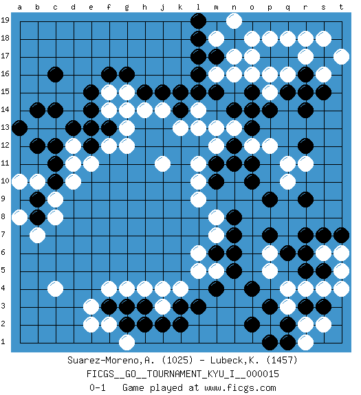 Last move : 0-1 2009 June 3 20:16:55 [Event "FICGS__GO__TOURNAMENT_KYU_I__000015"] [Site "FICGS"] [Date "2009.04.11"] [Round "1"] [Black "Suarez-Moreno,Alejandro"] [White "Lubeck,Kate"] [Result "0-1"] [Rating 1 "1025"] [Rating 2 "1457"] 1.q17 q4 2.c16 c4 3.r14 j3 4.r6 d10 5.o4 p5 6.p3 q3 7.l3 k4 8.m4 l5 9.n6 m7 10.n7 m8 11.p7 c13 12.e15 j11 13.j15 m12 14.m15 q10 15.r9 q11 16.r3 r4 17.s3 g13 18.e13 f12 19.c12 d12 20.c11 d11 21.b9 c8 22.d13 b13 23.c10 c9 24.b8 b7 25.b12 a10 26.b14 a8 27.a13 b10 28.c14 g15 29.g14 h14 30.h15 f14 31.g16 f15 32.f16 j14 33.k14 k13 34.o11 p12 35.o10 o12 36.m10 l9 37.o14 p2 38.o2 s4 39.q2 r2 40.q1 r1 41.p1 s2 42.g2 e2 43.f3 e3 44.j2 f4 45.h3 h4 46.k3 j4 47.p9 o17 48.l15 r17 49.r16 q18 50.s17 r18 51.p17 p18 52.n18 n17 53.m17 q16 54.p16 s16 55.r15 s18 56.s15 t17 57.r12 r11 58.n12 n13 59.n11 l13 60.o13 p15 61.q15 o16 62.p14 q16 63.n14 m13 64.s5 t4 65.q6 f2 66.g3 g1 67.k2 g4 68.h2 m5 69.n5 m16 70.l16 m18 71.l17 n19 72.l18 o18 73.l19 l14 74.k15 l10 75.e12 e11 76.m11 l11 77.f13 g12 78.e14 g14 79.m6 l6 80.o15 p16 81.n8 s6 82.s7 t6 83.t7 t5 84.r5 p6 85.r7 n16 0-1 Here are the names of the openings (joseki) played in the four corners : Corner q4 : q4 r6 Hoshi (Hwajeom, Seongjeom, Xingwei`) 4-4 Point. The star or hoshi (4-4) point, emphasizing influence at the potential expense of territory. Ikken Kakari (Hankan Keolch'im, Yi Gua`jiao~, 1-Space Low Approach). Black 2 is the standard approach move to the 4-4. Corner d16 : c16 c13 Komoku (Somok, Xiao~mu`) 3-4 Point. The komoku (3-4) point is the traditional corner enclosure move.. Player White won this Go (weiqi, baduk) game. Follow this game move after move (download)Stop on second, extend on third. (Anonymous) Chess is as much a mystery as women. (Purdy)