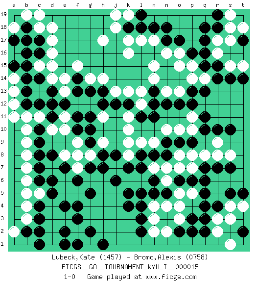 Last move : 1-0 2009 November 4 6:5:20 [Event "FICGS__GO__TOURNAMENT_KYU_I__000015"] [Site "FICGS"] [Date "2009.04.11"] [Round "1"] [Black "Lubeck,Kate"] [White "Bromo,Alexis"] [Result "1-0"] [Rating 1 "1457"] [Rating 2 "0758"] 1.q16 d4 2.q4 d16 3.q10 k10 4.k4 k16 5.f3 e3 6.f4 d10 7.n17 n13 8.p13 o10 9.h8 f5 10.g5 e5 11.k18 h17 12.c17 d17 13.c16 c15 14.b15 c18 15.b18 d18 16.c14 d15 17.b13 n7 18.o6 m15 19.m6 n6 20.n5 o7 21.p6 p7 22.q7 q8 23.r7 r8 24.s10 o5 25.q5 p5 26.q6 n4 27.m5 m4 28.l4 o4 29.l3 m7 30.l7 l6 31.l5 k6 32.k7 j7 33.j8 k8 34.l8 k9 35.j6 m3 36.l2 m2 37.p3 o3 38.o2 l9 39.m8 m9 40.n8 o8 41.n9 n10 42.k5 f2 43.g2 g1 44.e2 d2 45.f1 d1 46.h1 o15 47.o9 p8 48.p9 b11 49.d13 e13 50.g10 f9 51.g9 f8 52.g7 f7 53.e4 d3 54.q15 p14 55.q13 q14 56.r14 p15 57.p16 o16 58.o17 m17 59.m18 l17 60.l18 k17 61.e12 d14 62.f13 e14 63.d11 c11 64.c12 e11 65.d12 f12 66.f11 e10 67.b12 a12 68.c10 b10 69.c9 b9 70.c8 b8 71.c7 b7 72.c6 b6 73.d5 c5 74.d6 a13 75.f6 a14 76.a15 b17 77.b16 b19 78.a17 a11 79.b14 a18 80.b17 c19 81.g13 g14 82.h13 j13 83.j12 e6 84.e7 n2 85.p2 r3 86.r4 s4 87.s5 t4 88.t5 s3 89.q3 r2 90.t2 s1 91.q2 g12 92.h12 h14 93.k12 k13 94.m12 l12 95.l11 l13 96.n12 o13 97.o12 p10 98.q11 k11 99.m11 h11 100.g11 j18 101.m13 m14 102.f14 f15 103.e1 g8 104.h7 r17 105.q17 r16 106.r15 s15 107.s14 t15 108.r18 s18 109.q18 s19 110.t17 t18 111.t14 s17 112.c4 b5 113.c3 b4 114.b2 b3 115.c2 a2 116.c1 k19 117.l19 j19 118.n18 n16 119.r19 r9 120.r10 s8 121.s7 p11 122.p12 h9 123.f10 e8 124.d8 1-0 Here are the names of the openings (joseki) played in the four corners : Corner d4 : d4 f3 Hoshi (Hwajeom, Seongjeom, Xingwei`) 4-4 Point. The star or hoshi (4-4) point, emphasizing influence at the potential expense of territory. Ikken Kakari (Hankan Keolch'im, Yi Gua`jiao~, 1-Space Low Approach). Black 2 is the standard approach move to the 4-4. Corner q4 : q4 n7 Hoshi (Hwajeom, Seongjeom, Xingwei`) 4-4 Point. The star or hoshi (4-4) point, emphasizing influence at the potential expense of territory. Player Black won this Go (weiqi, baduk) game. Follow this game move after move (download)Knight's moves win running battles. (Anonymous) You know what they say : You lie down with the Devil, you wake up in Hell. (Horatio Caine, C.S.I. Miami)