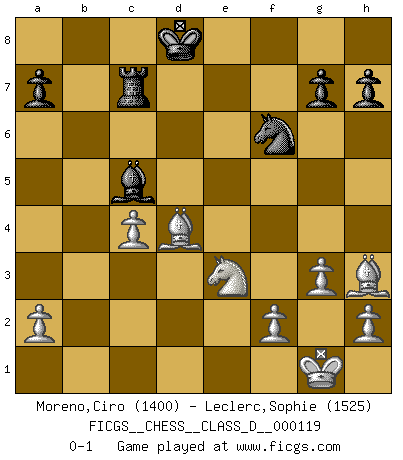 Last move : 0-1 2009 August 7 12:29:19 [Event "FICGS__CHESS__CLASS_D__000119"] [Site "FICGS"] [Date "2009.04.12"] [Round "1"] [White "Moreno,Ciro"] [Black "Leclerc,Sophie"] [Result "0-1"] [WhiteElo "1400"] [BlackElo "1525"] 1.c4 c5 2.Nc3 Nc6 3.g3 b6 4.Bg2 Bb7 5.d3 e6 6.Nf3 d6 7.O-O Nf6 8.e4 Qc7 9.d4 cxd4 10.Nxd4 Nxd4 11.Qxd4 Qc5 12.Qxc5 bxc5 13.Rd1 O-O-O 14.Rb1 Be7 15.b4 cxb4 16.Rxb4 d5 17.Rxb7 Kxb7 18.exd5 Bb4 19.dxe6 Kc8 20.exf7 Rxd1+ 21.Nxd1 Rf8 22.Be3 Rxf7 23.Bd4 Rc7 24.Ne3 Bc5 25.Bh3+ Kd8 0-1 English : Symmetrical variation Kingside Castling by player White (move 7) Queenside Castling by player Black (move 13) Player Black won this chess game. Follow this game move after move (download)I still hope to kill Fischer. (Boris Spassky) Im Spitzenschach von heute geht es nur um Vorbereitung, um tiefgründige, sorgfältige Eröffnungsvorbereitung. (Nigel Short) Un buen sacrificio es aquel que aunque no sea necesariamente sólido, deja a tu oponente aturdido y confuso. (Rudolph Spielmann) La victoire dans une partie d'Echecs appartient la plupart du temps à celui qui voit un peu plus loin que l'adversaire. (Lasker) Always two there are. No more no less. A master, and an apprentice. (Master Yoda in Star Wars ep.1)