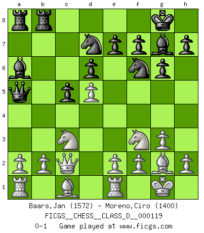 Last move : 0-1 2009 July 7 10:2:41 [Event "FICGS__CHESS__CLASS_D__000119"] [Site "FICGS"] [Date "2009.04.12"] [Round "1"] [White "Baars,Jan"] [Black "Moreno,Ciro"] [Result "0-1"] [WhiteElo "1572"] [BlackElo "1400"] 1.d4 c5 2.d5 Nf6 3.c4 b5 4.cxb5 a6 5.bxa6 Bxa6 6.Nc3 g6 7.Nf3 Bg7 8.g3 d6 9.Bg2 Nbd7 10.O-O O-O 11.Re1 Qa5 12.Qc2 Rfb8 0-1 This chess game has been lost on time (started : 2009.04.12 11:0:13) Old Benoni defense Kingside Castling by player White (move 10) Kingside Castling by player Black (move 10) Player Black won this chess game. Follow this game move after move (download)I like the moment when I break a man's ego. (Bobby Fischer) Ich habe Putins Aufstieg an die Macht beobachtet und seine Politik, die demokratischen Institutionen meines Landes zu zerstören. (Garry Kasparov) Mi estilo es algo parecido entre un poco de Tal y Petrosian. (Reshevsky) Avec des compensations pour le matériel en plus... (Anonyme) What doesn't kill us makes us stronger. (Friedrich Nietzsche)