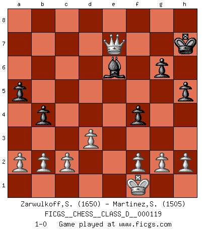 Last move : 1-0 2009 June 7 2:18:28 [Event "FICGS__CHESS__CLASS_D__000119"] [Site "FICGS"] [Date "2009.04.12"] [Round "1"] [White "Zarwulkoff,Steve"] [Black "Martinez,Silvio"] [Result "1-0"] [WhiteElo "1650"] [BlackElo "1505"] 1.e4 e5 2.Nf3 Nc6 3.Bb5 Nge7 4.O-O a6 5.Ba4 b5 6.Bb3 d5 7.exd5 Nxd5 8.Re1 Be7 9.Nxe5 Nxe5 10.Rxe5 c6 11.Nc3 O-O 12.Nxd5 cxd5 13.Bxd5 Ra7 14.Qh5 g6 15.Qf3 Bf6 16.Re3 Bd4 17.d3 Bxe3 18.Bxe3 Qa5 19.Bxa7 b4 20.Qf6 Qxd5 21.Bd4 Qxd4 22.Qxd4 a5 23.Re1 h5 24.Re5 f6 25.Qd5+ Kg7 26.Re7+ Kh6 27.Qc5 f5 28.Kf1 f4 29.Rh7+ Kxh7 30.Qxf8 Be6 31.Qe7+ 1-0 Ruy Lopez : Cozio defense Kingside Castling by player White (move 4) Kingside Castling by player Black (move 11) Player White won this chess game. Follow this game move after move (download)Chess holds its master in its own bonds, shackling the mind and brain so that the inner freedom of the very strongest must suffer. (Albert Einstein) Rubinstein ist ein Turmendspiel, welches die Götter vor tausenden von Jahren begannen. (Savielly Grigorievitsch Tartakower) El Ajedrez es el juego mas altamente simbólico, pero las agresiones estan por lo tanto aún mas francamente representadas en la partida. Tal vez comenzo como un juego de guerra; Algo como la representación de una batalla en miniatura entre las fuerzas de dos reinos. (Karl Meninger) Vous n'êtes pas toujours obligé de jouer le meilleur coup. Un coup doit être actif, entreprenant, correct et beau ! (David Bronstein) All men can see these tactics whereby I conquer, but what none can see is the strategy out of which victory is evolved. (Sun Tzu)