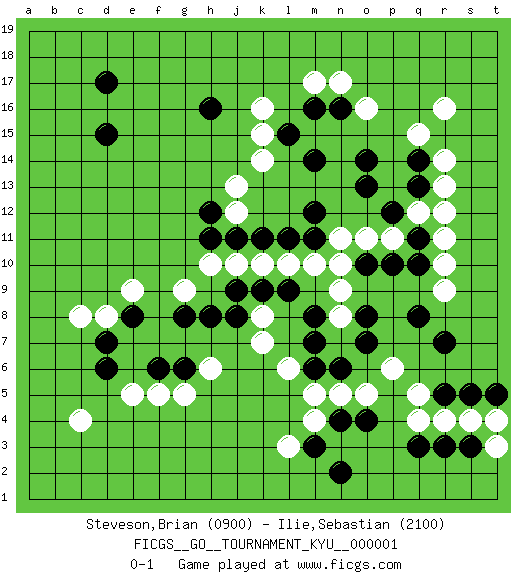 Last move : 0-1 2006 October 30 22:52:57 [Event "FICGS__GO__TOURNAMENT_KYU__000001"] [Site "FICGS"] [Date "2006.09.08"] [Round "1"] [Black "Steveson,Brian"] [White "Ilie,Sebastian"] [Result "0-1"] [Rating 1 "0900"] [Rating 2 "2100"] 1.d17 c4 2.q3 r16 3.d15 k16 4.q14 q12 5.q10 r14 6.q13 r13 7.o14 q15 8.o13 p11 9.m12 o16 10.h16 q5 11.r7 p6 12.p10 o11 13.o10 n11 14.m14 k14 15.m11 n10 16.s5 r4 17.n4 r9 18.q8 r10 19.o7 n5 20.n6 o5 21.o4 m5 22.m6 m4 23.r3 s4 24.s3 t3 25.m3 l3 26.n2 m10 27.k11 l10 28.l11 n8 29.o8 l6 30.m8 n9 31.m7 k8 32.q11 r11 33.p12 r12 34.l9 k10 35.k9 j10 36.j8 k7 37.j9 j12 38.l15 k15 39.n16 n17 40.m16 m17 41.j11 h10 42.h12 j13 43.h11 h6 44.g8 g9 45.h8 e9 46.g6 g5 47.f6 f5 48.e8 d8 49.d6 e5 50.d7 c8 51.r5 q4 52.t5 t4 0-1 Here are the names of the openings (joseki) played in the four corners : Corner q16 : r16 q14 Komoku (Somok, Xiao~mu`) 3-4 Point. The komoku (3-4) point is the traditional corner enclosure move.. Corner q4 : q3 q5 Komoku (Somok, Xiao~mu`) 3-4 Point. The komoku (3-4) point is the traditional corner enclosure move.. Ikken Takagakari (Hankan Nop'dakeolch'im, Yi Gaogua`jiao~, 1-Space High Approach). The 5-4 approach move has become more popular in modern times, as modern Go emphasizes speed and influence. Corner d4 : c4 j8 Komoku (Somok, Xiao~mu`) 3-4 Point. The komoku (3-4) point is the traditional corner enclosure move.. Player White won this Go (weiqi, baduk) game. Follow this game move after move (download)Don't disturb symmetry. (Anonymous) Unless in communicating with it one says exactly what one means, trouble is bound to result. (Alan Turing, about computers)