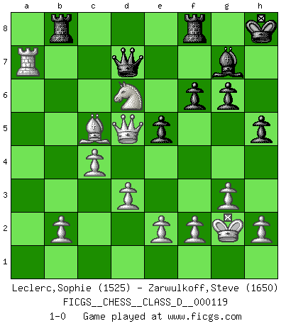 Last move : 1-0 2009 July 5 9:30:27 [Event "FICGS__CHESS__CLASS_D__000119"] [Site "FICGS"] [Date "2009.04.12"] [Round "1"] [White "Leclerc,Sophie"] [Black "Zarwulkoff,Steve"] [Result "1-0"] [WhiteElo "1525"] [BlackElo "1650"] 1.c4 c5 2.Nc3 g6 3.g3 Nc6 4.Nf3 Bg7 5.Bg2 e5 6.d3 Nge7 7.O-O d6 8.Bg5 O-O 9.Qb3 f6 10.Bd2 Rb8 11.Qa4 Bd7 12.Nb5 Nd4 13.Nfxd4 a6 14.Qb3 axb5 15.Nxb5 Bc6 16.a4 Bxg2 17.Kxg2 Ra8 18.a5 Nc6 19.Nc3 Nxa5 20.Qb5 Nc6 21.Qxb7 Nd4 22.Qd5+ Kh8 23.Ne4 Nb3 24.Nxd6 Rb8 25.Be3 Nxa1 26.Rxa1 Qd7 27.Bxc5 h5 28.Ra7 1-0 English : Symmetrical variation Kingside Castling by player White (move 7) Kingside Castling by player Black (move 8) Player White won this chess game. Follow this game move after move (download)In blitz, the Knight is stronger than the Bishop. (Vlastimil Hort) Wer sich die Fähigkeit anerziehen will im Schach selbstständig zu denken, der muß alles meiden, was leblos ist: ausgeklügelte Theorien, die sich auf sehr wenige Beispiele und eine Menge Hirngespinste stützen. (Emanuel Lasker) No es tiempo de jugar al Ajedrez cuando la casa esta en llamas. (Proverbio Italiano) L'ordinateur a tué l'originalité. Il n'y a plus guère d'aventures sur l'échiquier. (Jacob Murray) If everyone is thinking alike, then somebody isn't thinking. (US General George S. Patton)