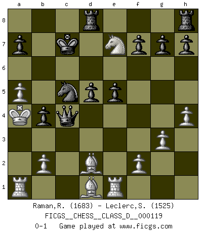 Last move : 0-1 2009 June 13 2:44:39 [Event "FICGS__CHESS__CLASS_D__000119"] [Site "FICGS"] [Date "2009.04.12"] [Round "1"] [White "Raman,Ranganathan"] [Black "Leclerc,Sophie"] [Result "0-1"] [WhiteElo "1683"] [BlackElo "1525"] 1.c4 c5 2.e4 Nc6 3.a3 e6 4.Nf3 d6 5.Nc3 Qb6 6.Ng5 Be7 7.Nf3 Nf6 8.d3 Bd7 9.h4 O-O-O 10.Bd2 Ng4 11.Na4 Qc7 12.g3 Nge5 13.Bg2 Nxd3+ 14.Ke2 Nde5 15.Qb3 Nxf3 16.Bxf3 Nd4+ 17.Kd3 Nxb3 18.Nc3 Nd4 19.Bd1 e5 20.Nd5 Qb8 21.Nxe7+ Kc7 22.Ba5+ b6 23.Bd2 Be6 24.a4 Qb7 25.a5 Bxc4+ 26.Kxc4 Qxe4 27.Re1 b5+ 28.Kc3 b4+ 29.Kc4 d5+ 30.Kxc5 Ne6+ 31.Kb5 Qc4+ 32.Ka4 Nc5+ 0-1 English : Symmetrical variation Queenside Castling by player Black (move 9) Player Black won this chess game. Follow this game move after move (download)A bad plan is better than none at all. (Frank Marshall) Gegen einen Schachcomputer zu verlieren ist wie Löcher in den Strümpfen zuhaben. Es ist nicht peinlich, solange man der einzige ist der es weiß. (Anonymous) Bobby solo arroja las piezas y solas caen en las casillas correctas. (Miguel Najdorf ) Vouloir jouer aux échecs contre soi-même est aussi paradoxal que vouloir marcher sur son ombre. (Stefan Zweig) Be who you are, and say what you feel because those who mind don't matter, and those who matter don't mind. (Dr Seuss)