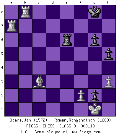 Last move : 1-0 2009 April 28 22:55:32 [Event "FICGS__CHESS__CLASS_D__000119"] [Site "FICGS"] [Date "2009.04.12"] [Round "1"] [White "Baars,Jan"] [Black "Raman,Ranganathan"] [Result "1-0"] [WhiteElo "1572"] [BlackElo "1683"] 1.d4 e6 2.c4 c6 3.Nc3 Bb4 4.Qc2 d5 5.a3 Ba5 6.b4 Bc7 7.cxd5 exd5 8.Nf3 f6 9.h3 Ne7 10.e3 Be6 11.b5 Nd7 12.Bd3 Ba5 13.Bd2 Rc8 14.a4 Rc7 15.O-O g6 16.Rfc1 O-O 17.e4 Bxc3 18.Qxc3 dxe4 19.Bxe4 cxb5 20.Qxc7 Qxc7 21.Rxc7 bxa4 22.d5 f5 23.dxe6 fxe4 24.Rxd7 exf3 25.Rxe7 fxg2 26.Bc3 h5 27.Rg7+ Kh8 28.Rxb7 Kg8 29.Rg7+ Kh8 30.Rxa7 Kg8 31.Rg7+ Kh8 32.Rxa4 Re8 33.R4a7 Rxe6 34.Rgb7 Kg8 35.Rb8+ 1-0 Queen's pawn Kingside Castling by player White (move 15) Kingside Castling by player Black (move 16) Player White won this chess game. Follow this game move after move (download)After black's reply to 1.e4 with 1..e5, leaves him always trying to get into the game. (Howard Staunton) Der beste Spieler in einem Turnier gewinnt es nie. Er landet auf Platz zwei oder drei. (Siegbert Tarrasch) El Ajedrez, como cualquier actividad creativa, solo puede existir a través del esfuerzo combinado de aquellos que tienen talento creativo y de aquellos que poseen la habilidad de organizar su trabajo creativo. (Mikhail Botvinnik) Les échecs, c'est l'imagination. (David Bronstein) Memory is a complicated thing, a relative to truth, but not its twin. (Barbara Kingsolver, Animal Dreams)
