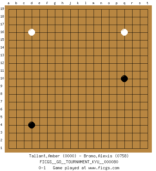 Last move : 0-1 2009 May 15 6:4:23 [Event "FICGS__GO__TOURNAMENT_KYU__000080"] [Site "FICGS"] [Date "2009.04.12"] [Round "1"] [Black "Tallant,Amber"] [White "Bromo,Alexis"] [Result "0-1"] [Rating 1 "0000"] [Rating 2 "0758"] 1.d4 q16 2.q10 d16 0-1 This go game has been lost on time (started : 2009.04.12 17:10:54) Here are the names of the openings (joseki) played in the four corners : Player White won this Go (weiqi, baduk) game. Follow this game move after move (download)If White takes all four corners, Black should resign; if Black takes all four corners, Black should also resign. (David Kent) Everybody lies. (Gregory House, House M.D.)