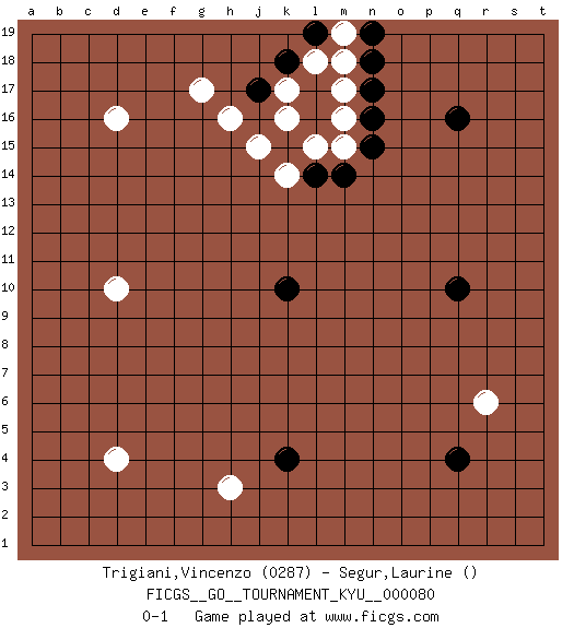 Last move : 0-1 2009 June 3 7:7:49 [Event "FICGS__GO__TOURNAMENT_KYU__000080"] [Site "FICGS"] [Date "2009.04.12"] [Round "1"] [Black "Trigiani,Vincenzo"] [White "Segur,Laurine"] [Result "0-1"] [Rating 1 "0287"] 1.q16 d4 2.q4 d16 3.k10 r6 4.q10 d10 5.k4 k16 6.k15 h16 7.l16 k17 8.l17 l15 9.l14 m15 10.m14 k14 11.n15 j15 12.k18 m16 13.n16 m17 14.n17 m18 15.n18 l18 16.l19 m19 17.n19 h3 18.j17 g17 0-1 This go game has been lost on time (started : 2009.04.12 17:10:54) Here are the names of the openings (joseki) played in the four corners : Corner q4 : q4 r6 Hoshi (Hwajeom, Seongjeom, Xingwei`) 4-4 Point. The star or hoshi (4-4) point, emphasizing influence at the potential expense of territory. Ikken Kakari (Hankan Keolch'im, Yi Gua`jiao~, 1-Space Low Approach). White 2 is the standard approach move to the 4-4. Player White won this Go (weiqi, baduk) game. Follow this game move after move (download)Good moves and bad moves are bedfellows. (Anonymous) I would love to change the world, but they won't give me the source code. (Unknown)