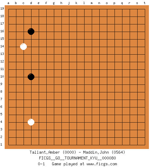 Last move : 0-1 2009 May 15 6:4:23 [Event "FICGS__GO__TOURNAMENT_KYU__000080"] [Site "FICGS"] [Date "2009.04.12"] [Round "1"] [Black "Tallant,Amber"] [White "Maddin,John"] [Result "0-1"] [Rating 1 "0000"] [Rating 2 "0564"] 1.d16 d4 2.d10 c14 0-1 This go game has been lost on time (started : 2009.04.12 17:10:54) Here are the names of the openings (joseki) played in the four corners : Corner d16 : d16 c14 Hoshi (Hwajeom, Seongjeom, Xingwei`) 4-4 Point. The star or hoshi (4-4) point, emphasizing influence at the potential expense of territory. Ikken Kakari (Hankan Keolch'im, Yi Gua`jiao~, 1-Space Low Approach). White 2 is the standard approach move to the 4-4. Corner d4 : d4 0-1 Hoshi (Hwajeom, Seongjeom, Xingwei`) 4-4 Point. The star or hoshi (4-4) point, emphasizing influence at the potential expense of territory. Player White won this Go (weiqi, baduk) game. Follow this game move after move (download)A meijin needs no joseki. (Anonymous) You can't play chess if you're groggy from pills. (Anatoly Karpov)