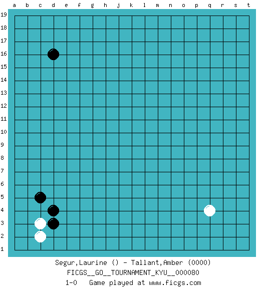 Last move : 1-0 2009 May 16 18:9:11 [Event "FICGS__GO__TOURNAMENT_KYU__000080"] [Site "FICGS"] [Date "2009.04.12"] [Round "1"] [Black "Segur,Laurine"] [White "Tallant,Amber"] [Result "1-0"] [Rating 2 "0000"] 1.d4 q4 2.d16 c3 3.d3 c2 4.c5 1-0 This go game has been lost on time (started : 2009.04.12 17:10:54) Here are the names of the openings (joseki) played in the four corners : Corner d4 : d4 c3 Hoshi (Hwajeom, Seongjeom, Xingwei`) 4-4 Point. The star or hoshi (4-4) point, emphasizing influence at the potential expense of territory. Player Black won this Go (weiqi, baduk) game. Follow this game move after move (download)Learning josekis by heart is useless if you don't try departing from them. (Pierre Audouard) Men should grow up. - Yeah. And dogs should stop licking themselves. It's not gonna happen. (Gregory House to Dr. Cameron, House M.D.)