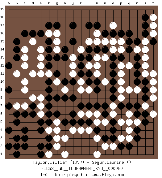 Last move : 1-0 2009 May 19 1:16:51 [Event "FICGS__GO__TOURNAMENT_KYU__000080"] [Site "FICGS"] [Date "2009.04.12"] [Round "1"] [Black "Taylor,William"] [White "Segur,Laurine"] [Result "1-0"] [Rating 1 "1097"] 1.q16 d4 2.c16 q4 3.j17 k4 4.r6 r9 5.o3 p5 6.r3 p3 7.r4 r5 8.s5 q5 9.p2 s7 10.s6 q3 11.q2 m3 12.c6 c9 13.f3 h3 14.c3 e3 15.c4 d5 16.d6 c5 17.b5 d2 18.c2 b7 19.b6 a6 20.f6 c1 21.b1 d1 22.b2 a5 23.a4 a3 24.a2 b4 25.b3 e6 26.e5 e7 27.e4 d3 28.a4 f4 29.f5 g4 30.f2 f1 31.g1 c7 32.d7 d8 33.a7 g3 34.q7 q6 35.r7 t6 36.s8 t8 37.s9 t10 38.s10 s11 39.r10 t11 40.r11 s12 41.r12 s13 42.r13 s14 43.r15 s15 44.s16 t16 45.t15 t17 46.s17 t18 47.s18 r14 48.q14 p15 49.q15 q9 50.o9 p9 51.o8 p8 52.p7 p10 53.o10 p11 54.o11 p12 55.o13 p14 56.p13 q12 57.o5 o7 58.n7 o6 59.n6 n5 60.o4 g2 61.e1 h1 62.e16 g15 63.g17 f16 64.f17 e14 65.j6 f1 66.e2 d11 67.j15 c13 68.a9 c10 69.f9 e8 70.f8 g7 71.f7 h6 72.j8 c14 73.h13 g14 74.h14 b11 75.f12 f11 76.g11 e12 77.f10 e11 78.g13 m5 79.f15 g16 80.f14 t9 81.h5 g5 82.g6 h7 83.j5 h9 84.h8 j7 85.k7 k6 86.k5 l6 87.l7 j4 88.l5 m6 89.m7 l4 90.g8 n2 91.n3 o2 92.m4 m1 93.b15 c12 94.a12 d15 95.d16 e13 96.f13 g10 97.h10 o17 98.p16 o14 99.n14 o15 100.o16 n15 101.n16 m15 102.m14 m16 103.m17 l15 104.l17 n13 105.o12 m13 106.l14 k14 107.l13 l12 108.k13 j13 109.k12 j12 110.k11 j11 111.j10 k10 112.l11 m12 113.b14 m11 114.l10 k9 115.b13 l9 116.m10 n10 117.m9 1-0 Here are the names of the openings (joseki) played in the four corners : Corner q4 : q4 r6 Hoshi (Hwajeom, Seongjeom, Xingwei`) 4-4 Point. The star or hoshi (4-4) point, emphasizing influence at the potential expense of territory. Ikken Kakari (Hankan Keolch'im, Yi Gua`jiao~, 1-Space Low Approach). Black 2 is the standard approach move to the 4-4. Corner d4 : d4 c6 Hoshi (Hwajeom, Seongjeom, Xingwei`) 4-4 Point. The star or hoshi (4-4) point, emphasizing influence at the potential expense of territory. Ikken Kakari (Hankan Keolch'im, Yi Gua`jiao~, 1-Space Low Approach). Black 2 is the standard approach move to the 4-4. Corner q16 : q16 s11 Hoshi (Hwajeom, Seongjeom, Xingwei`) 4-4 Point. The star or hoshi (4-4) point, emphasizing influence at the potential expense of territory. Player Black won this Go (weiqi, baduk) game. Follow this game move after move (download)Win the early ko to win the game. (Anonymous) All the biggest technological inventions created by man - the airplane, the automobile, the computer - says little about his intelligence, but speaks volumes about his laziness. (Mark Kennedy)