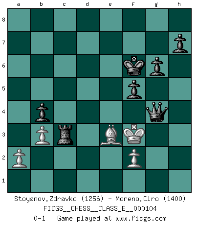 Last move : 0-1 2009 April 28 19:18:58 [Event "FICGS__CHESS__CLASS_E__000104"] [Site "FICGS"] [Date "2009.04.14"] [Round "1"] [White "Stoyanov,Zdravko"] [Black "Moreno,Ciro"] [Result "0-1"] [WhiteElo "1256"] [BlackElo "1400"] 1.e4 c5 2.Nf3 Nc6 3.Bb5 g6 4.Bxc6 bxc6 5.h3 Ba6 6.d3 Bg7 7.O-O Rb8 8.c3 Nf6 9.Re1 O-O 10.b3 d6 11.c4 Nxe4 12.Rxe4 Bxa1 13.Bh6 Bg7 14.Bg5 f6 15.Bh4 Qd7 16.Qe2 e5 17.Nbd2 d5 18.cxd5 cxd5 19.Ra4 Bb5 20.Rg4 e4 21.dxe4 Bxe2 22.exd5 Bxf3 23.Nxf3 Qxd5 24.Bg3 Qd1+ 25.Kh2 Rb4 26.Rxb4 cxb4 27.Ng1 f5 28.Bf4 Rc8 29.Be3 Rc2 30.Bxa7 Be5+ 31.g3 Bxg3+ 32.Kxg3 Qxg1+ 33.Kf3 Qh1+ 34.Kg3 Rc3+ 35.Be3 Kf7 36.h4 Kf6 37.Kf4 Qxh4+ 38.Kf3 Qg4+ 0-1 Sicilian : Nimzovich-Rossolimo attack (with ...g6, without ...d6) Kingside Castling by player White (move 7) Kingside Castling by player Black (move 9) Player Black won this chess game. Follow this game move after move (download)Chess is 99 percent tactics. (Teichmann) Es war undenkbar für die Behörden, dass ein sowjetischer Großmeister auf diese Art und Weise [Fischer-Taimanov 6:0] verliert, ohne dass es eine politischer Erklärung dafür gäbe. (Mark Taimanov) A la fecha, Fischer esta simplemente un nivel arriba de todos los mejores jugadores de Ajedrez del mundo. (John Jacobs) La vie est comme un jeu d'échecs : nous esquissons un plan, mais celui-ci est tributaire de ce que daignent faire l'adversaire aux échecs et le destin dans la vie. (Arthur Schopenhauer) We need strong personalities and only one world champion to attract sponsors. (Anatoly Karpov)