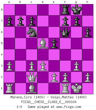 Last move : 1-0 2009 June 28 0:27:46 [Event "FICGS__CHESS__CLASS_E__000104"] [Site "FICGS"] [Date "2009.04.14"] [Round "1"] [White "Moreno,Ciro"] [Black "Volpi,Matteo"] [Result "1-0"] [WhiteElo "1400"] [BlackElo "1400"] 1.c4 e5 2.Nc3 Nc6 3.Nf3 Nf6 4.g3 d5 5.cxd5 Nxd5 6.Bg2 Nb6 7.d3 Bb4 8.O-O O-O 9.a3 Bxc3 10.bxc3 Nd5 11.Qc2 Be6 12.Ng5 h6 13.Nxe6 Qf6 14.Nxf8 Rxf8 15.Bxd5 1-0 English : Four knights, kingside Fianchetto Kingside Castling by player White (move 8) Kingside Castling by player Black (move 8) Player White won this chess game. Follow this game move after move (download)Chess is imagination. (David Bronstein) Ich möchte Schüler heranbilden, die das Vermögen haben, selbst zu denken und Kritik zu üben. (Emanuel Lasker) Muchos jugadores de Ajedrez se sorprendían cuando después de la partida, Fischer explicaba con calma: 'Yo ya había analizado esta posibilidad' en una posición en la cual yo creía que no era posible de prever desde la apertura. (Mikhail Tal) Aidez vos pièces, elles vous aideront. (Paul Morphy) A good programmer is someone who always looks both ways before crossing a one-way street. (Doug Linder)