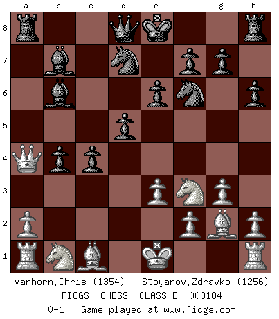 Last move : 0-1 2009 June 20 8:32:7 [Event "FICGS__CHESS__CLASS_E__000104"] [Site "FICGS"] [Date "2009.04.14"] [Round "1"] [White "Vanhorn,Chris"] [Black "Stoyanov,Zdravko"] [Result "0-1"] [WhiteElo "1354"] [BlackElo "1256"] 1.c3 c5 2.e3 a6 3.d4 e6 4.dxc5 Bxc5 5.Bc4 d5 6.Bf1 b5 7.g3 Bb7 8.Bg2 Nf6 9.b4 Bb6 10.c4 bxc4 11.Nh3 a5 12.Ng5 h6 13.Qa4+ Nbd7 14.Nf3 axb4 0-1 Saragossa Opening Player Black won this chess game. Follow this game move after move (download)Help your pieces so they can help you. (Paul Morphy) Wenn du auf das Glück wartest, wird das Leben ziemlich langweilig. (Mikhail Nekhemyevich Tal) Para mi, el Ajedrez es la vida y cada partida es como una nueva vida. Todo jugador de Ajedrez suele vivir muchas vidas durante su vida. (Eduard Gufeld) Des points faibles ou des trous dans la position de l'adversaire doivent être occupés par des pièces et non pas par des pions. (Siegbert Tarrasch) Memory is a crazy woman that hoards colored rags and throws away food. (Austin O'Malley)