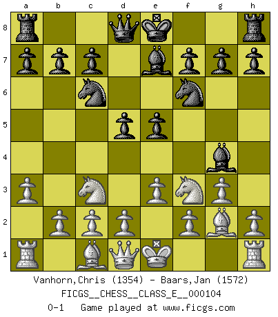 Last move : 0-1 2009 May 25 18:35:41 [Event "FICGS__CHESS__CLASS_E__000104"] [Site "FICGS"] [Date "2009.04.14"] [Round "1"] [White "Vanhorn,Chris"] [Black "Baars,Jan"] [Result "0-1"] [WhiteElo "1354"] [BlackElo "1572"] 1.a3 e5 2.g3 d5 3.Bg2 Nf6 4.e3 Be7 5.Nf3 Nc6 6.Nc3 Bg4 0-1 This chess game has been lost on time (started : 2009.04.14 0:31:25) Anderssen's Opening Player Black won this chess game. Follow this game move after move (download)A man without frontiers. He didn't divide the East and the West, he brought them together in their admiration for him. (Ljubomir Ljubojevic, about Bobby Fischer's death) Aljechin war kein Nazi. Er war ein Opportunist. Ein schrecklicher Mann. Er liebte Geld über alles und würde für Geld ein Jude, ein Katolik oder ein Protestant werden. (Miguel Najdorf) El Ajedrez es 99 por ciento táctica. (Teichmann) Karpov est une pièce de musée. (Garry Kasparov) You can only get smarter by playing a smarter opponent. (Revolver, movie)
