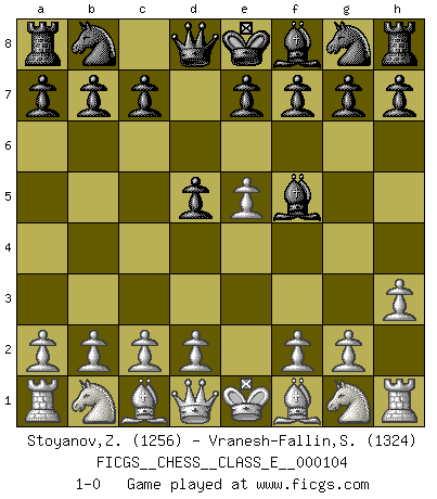 Last move : 1-0 2009 May 25 18:35:41 [Event "FICGS__CHESS__CLASS_E__000104"] [Site "FICGS"] [Date "2009.04.14"] [Round "1"] [White "Stoyanov,Zdravko"] [Black "Vranesh-Fallin,Scott"] [Result "1-0"] [WhiteElo "1256"] [BlackElo "1324"] 1.e4 d5 2.e5 Bf5 3.h3 1-0 This chess game has been lost on time (started : 2009.04.14 0:31:25) Scandinavian (centre counter) defense Player White won this chess game. Follow this game move after move (download)My God, Bobby Fischer plays so simply. (Alexei Suetin) Wenn ich mich einlogge, glauben die Leute gewöhnlich nicht, dass ich es selbst bin und sie fangen an, mir dumme Fragen zu stellen. Und wenn sie es glauben, stellen sie wieder andere dumme Fragen. (Judith Polgar) Creo que una cierta cantidad de temperamento es esperada de los genios del Ajedrez. (Ron Gross) Les Echecs représentent une sphère d'idées créatrices basée sur la volonté des deux protagonistes. (Smyslov) It is not true that people stop pursuing dreams because they grow old, they grow old because they stop pursuing dreams. (Gabriel Garcia Marquez)