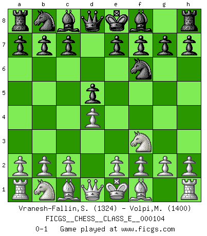 Last move : 0-1 2009 May 24 6:33:51 [Event "FICGS__CHESS__CLASS_E__000104"] [Site "FICGS"] [Date "2009.04.14"] [Round "1"] [White "Vranesh-Fallin,Scott"] [Black "Volpi,Matteo"] [Result "0-1"] [WhiteElo "1324"] [BlackElo "1400"] 1.d4 d5 2.Nf3 Nf6 0-1 This chess game has been lost on time (started : 2009.04.14 0:31:25) Queen's pawn game Player Black won this chess game. Follow this game move after move (download)You may learn much more from a game you lose than from a game you win. You will have to lose hundreds of games before becoming a good player. (Jose Raul Capablanca) Der Bart als Geschlechtszeichen mitten im Gesicht ist obszön. Daher gefällt er den Weibern. [Zugegeben, kein Schachzitat, aber unglaublich originell] (Arthur Schopenhauer) El Ajedrez es la vida. (Bobby Fischer) Les Cavaliers se révèlent fort utiles dans les positions fermées. D'habitude, les Fous sont un peu plus forts que les Cavaliers dans les positions ouvertes. Qu'on le veuille ou non, il restera toujours des exceptions ! Luck is what you have left over after you give 100 percent. (Langston Coleman)