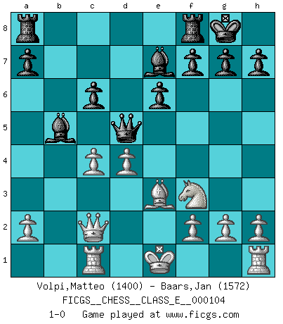 Last move : 1-0 2009 April 21 12:56:7 [Event "FICGS__CHESS__CLASS_E__000104"] [Site "FICGS"] [Date "2009.04.14"] [Round "1"] [White "Volpi,Matteo"] [Black "Baars,Jan"] [Result "1-0"] [WhiteElo "1400"] [BlackElo "1572"] 1.e4 c6 2.d4 d5 3.exd5 cxd5 4.c4 Nf6 5.cxd5 Nxd5 6.Nc3 Nc6 7.Bb5 Nxc3 8.bxc3 Qd5 9.Bxc6+ bxc6 10.Nf3 Ba6 11.Be3 e6 12.Qa4 Bb5 13.Qc2 Be7 14.Rc1 O-O 15.c4 1-0 Caro-Kann : Panov-Botvinnik attack Kingside Castling by player Black (move 14) Player White won this chess game. Follow this game move after move (download)Your body has to be in top condition. Your Chess deteriorates as your body does. You can't separate body from mind. (Bobby Fischer) Im Schach gewinnt jeder. Hat man Freunde am Spiel - und das ist die Hauptsache - ist auch der Verlust einer Partie kein Unglück. (David Bronstein) Aún deseo matar a Fischer. (Boris Spassky) Comme les marins qui ont mille raisons différentes d'aller en mer, les joueurs d'échecs en ont tout autant avant de s'installer devant une table et jouer... (Vincent Bertignac, philosophe) Tomorrow's what you make of it. (Horatio Caine, C.S.I. Miami)