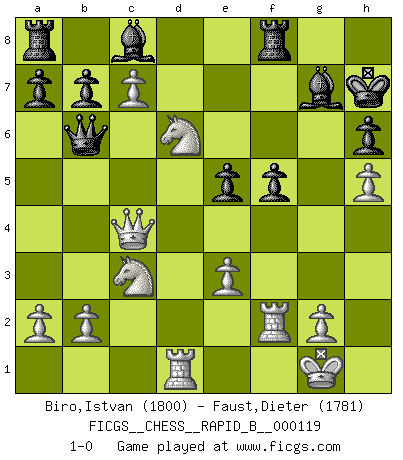 Last move : 1-0 2009 July 17 10:28:46 [Event "FICGS__CHESS__RAPID_B__000119"] [Site "FICGS"] [Date "2009.04.14"] [Round "1"] [White "Biro,Istvan"] [Black "Faust,Dieter"] [Result "1-0"] [WhiteElo "1800"] [BlackElo "1781"] 1.d4 Nf6 2.Bg5 e6 3.e3 h6 4.Bxf6 Qxf6 5.Nf3 d5 6.c4 c6 7.Nc3 Nd7 8.Bd3 dxc4 9.Bxc4 g6 10.Qc2 Bg7 11.h4 O-O 12.h5 g5 13.Bd3 g4 14.Nd2 e5 15.d5 Nc5 16.Nde4 Nxd3+ 17.Qxd3 Qd8 18.Rd1 f5 19.Qc4 Kh8 20.dxc6 Qb6 21.Nd6 Kh7 22.c7 g3 23.O-O gxf2+ 24.Rxf2 1-0 Trompowsky attack (Ruth, Opovcensky Opening) Kingside Castling by player Black (move 11) Kingside Castling by player White (move 23) Player White won this chess game. Follow this game move after move (download)What is the difference between chess and football? Everybody understands football, but nobody plays it. Everybody plays chess, but nobody understands it. Everything is relative. (Vladimir Kramnik) Wenn Capablanka heute auf der Schachbühne erscheinen würde, hätte er ein halbes Jahr gebraucht um sich die Schachtheorie anzueignen. Und dann hätte er alles und jeden besiegt. (Mikhail Moiseyevich Botvinik) La vida es como un juego de Ajedrez, cambiando con cada movimiento. (Proverbio Chino) Roi des jeux et jeu des rois, les échecs portent en eux un sentiment d'infini. Ils donnent à celui qui s'est efforcé d'en approfondir les arcanes l'impression de n'être pas à la mesure de l'homme; en fait, ils constituent un résumé de l'univers, un microcosme, et figurent cette grande échelle qui, dans les plans de la lumière descend jusqu'à la matière, qui des abîmes insondables remonte jusqu'en l'infini de Dieu. (Pyrame) Even the best needles are not sharp at both ends. (Chinese proverb)