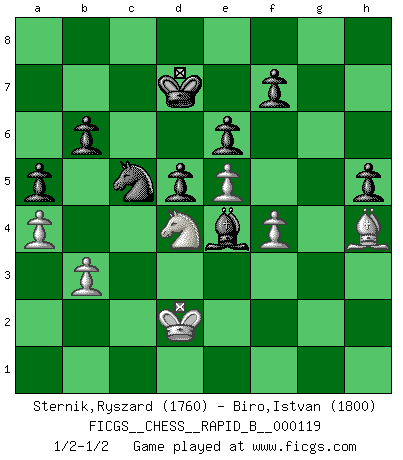 Last move : 1/2-1/2 2009 July 28 21:7:36 [Event "FICGS__CHESS__RAPID_B__000119"] [Site "FICGS"] [Date "2009.04.14"] [Round "1"] [White "Sternik,Ryszard"] [Black "Biro,Istvan"] [Result "1/2-1/2"] [WhiteElo "1760"] [BlackElo "1800"] 1.e4 c6 2.d4 d5 3.e5 c5 4.Nf3 Nc6 5.dxc5 e6 6.Be3 Nge7 7.c3 Bd7 8.Nbd2 Nf5 9.Bf4 Bxc5 10.Nb3 Be7 11.Qd2 a5 12.a4 Qb6 13.Bb5 Nb8 14.Nfd4 Bxb5 15.Nxf5 Bc4 16.Nxe7 Nd7 17.Nd4 Kxe7 18.h4 Nc5 19.Rh3 Bb3 20.Be3 Qc7 21.h5 Bc4 22.h6 gxh6 23.f4 Rag8 24.Rxh6 Rg3 25.Rh3 Rhg8 26.Rxg3 Rxg3 27.O-O-O Ne4 28.Qe1 Qd7 29.Bf2 Rxg2 30.Bh4+ Kf8 31.Qh1 Rg6 32.b3 Nxc3 33.Rg1 Bd3 34.Rxg6 Bxg6 35.Kb2 Ne4 36.Qc1 Kg8 37.Ka2 Kg7 38.Kb2 h5 39.Ka2 b6 40.Ka1 Nc5 41.Qc3 Kh7 42.Ka2 Nd3 43.Bg5 Kg8 44.Ka1 Nc5 45.Bh4 Qe8 46.Ka2 Qf8 47.Nc6 Ne4 48.Qd4 Qc5 49.Qxc5 Nxc5 50.Kb2 Kf8 51.Kc3 Ne4+ 52.Kb2 Ke8 53.Nd4 Kd7 54.Kc1 Nc5 55.Kd2 Bb1 56.Kc1 Bf5 57.Kd2 Be4 1/2-1/2 Caro-Kann : Advance variation Queenside Castling by player White (move 27) This chess game ended in a draw. Follow this game move after move (download)Best by test: 1. e4 (Bobby Fischer) Was ist der Unterschied zwischen einem Strassenarbeiter und einem Schachspieler? --Der Schachspieler bewegt sich ab und zu. (Anonymous) El Ajedrez por encima de todo... ¡es una pelea!. (Emanuel Lasker) Un journaliste : 'Vous préférez avoir une dame de plus sur l'échiquier ou au lit ?' Boris Spassky : 'Ca dépend de la position.' All the troubles of the world come from being unable to sit alone in a quiet room. (Blaise Pascal)