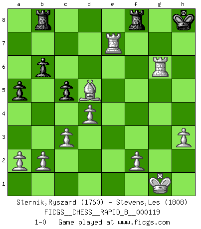 Last move : 1-0 2009 May 19 18:30:46 [Event "FICGS__CHESS__RAPID_B__000119"] [Site "FICGS"] [Date "2009.04.14"] [Round "1"] [White "Sternik,Ryszard"] [Black "Stevens,Les"] [Result "1-0"] [WhiteElo "1760"] [BlackElo "1808"] 1.e4 e5 2.Nf3 Nf6 3.Nxe5 d6 4.Nf3 Nxe4 5.d4 d5 6.Bd3 Be7 7.O-O O-O 8.Nbd2 Nxd2 9.Qxd2 Nc6 10.c3 Bg4 11.Qf4 Bh5 12.Qg3 Bd6 13.Bf4 Bxf4 14.Qxf4 Ne7 15.Rae1 Ng6 16.Qf5 Bxf3 17.Qxf3 Qg5 18.Qe3 Nf4 19.g3 h5 20.Qxf4 Qxf4 21.gxf4 f5 22.Re5 c6 23.Bxf5 g6 24.Bxg6 Rxf4 25.Bxh5 Kh7 26.Be8 Rb8 27.Re7+ Kh8 28.h3 Rf8 29.Bf7 a5 30.Rfe1 b6 31.R1e6 c5 32.Rh6+ Kg7 33.Rg6+ Kh8 34.Bxd5 1-0 Petrov : Classical attack, Mason variation Kingside Castling by player White (move 7) Kingside Castling by player Black (move 7) Player White won this chess game. Follow this game move after move (download)You must take your opponent into a deep dark forest where 2+2=5, and the path leading out is only wide enough for one. (Mikhail Tal) Das Schach hält seine Meister in eigenen Banden, Fesseln; auf vielerlei Weise formt es ihren Geist, so dass die innere Freiheit selbst des Stärksten beeinflusst wird. (Albert Einstein) Solo puedes ser bueno en el Ajedrez si amas al juego. (Bobby Fischer) Il n'y a pas de prix trop élevé au scalp de l'ennemi. (Koblentz) Art is the only way to run away without leaving home. (Twyla Tharp)