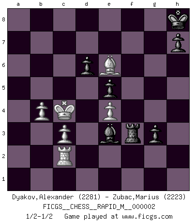 Last move : 1/2-1/2 2006 September 11 13:7:35 [Event "FICGS__CHESS__RAPID_M__000002"] [Site "FICGS"] [Date "2006.04.18"] [Round "1"] [White "Dyakov,Alexander"] [Black "Zubac,Marius"] [Result "1/2-1/2"] [WhiteElo "2281"] [BlackElo "2223"] 1.e4 c5 2.Nf3 Nc6 3.d4 cxd4 4.Nxd4 Nf6 5.Nc3 e5 6.Ndb5 d6 7.Bg5 a6 8.Na3 b5 9.Nd5 Be7 10.Bxf6 Bxf6 11.c3 O-O 12.Nc2 Bg5 13.a4 bxa4 14.Rxa4 a5 15.Bc4 Rb8 16.b3 Kh8 17.h4 Bh6 18.g4 Bf4 19.Nce3 Ne7 20.Nxe7 Qxe7 21.Nd5 Qd8 22.Ra1 Be6 23.g5 Rc8 24.Qd3 Bxd5 25.Bxd5 Qc7 26.Bc4 f6 27.gxf6 Rxf6 28.Qd5 Rcf8 29.Rxa5 Qc8 30.Ra2 Bh6 31.b4 Rf3 32.Rc2 Rh3 33.Rf1 Rxh4 34.Qd3 Qg4 35.f3 Qf4 36.Bd5 Rh3 37.Kd1 g5 38.Qd2 Qxd2 39.Kxd2 g4 40.Kd3 Rhxf3 41.Rxf3 Rxf3 42.Kc4 g3 43.Be6 Be3 1/2-1/2 Sicilian : Pelikan (Lasker/Sveshnikov) variation Kingside Castling by player Black (move 11) This chess game ended in a draw. Follow this game move after move (download)We must make sure that Chess will not be like a dead language, very interesting, but for a very small group. (Sytze Faber) Modernes Schach erfordert enorme Anspannung. Es ist für einen normalen Menschen unmöglich das auszuhalten. (Viktor Kortschnoi) Un sacrificio se refuta mucho mejor al aceptarlo. (Wilhelm Steinitz) Demandez au pauvre Cg1 ce qu'il en pense. Eduard Gufeld à propos de la variante Saemisch de l'Est-Indienne. Life is like a game of cards: the hand you are dealt represents determinism; the way you play it is free will. (Jawaharlal Nehru)