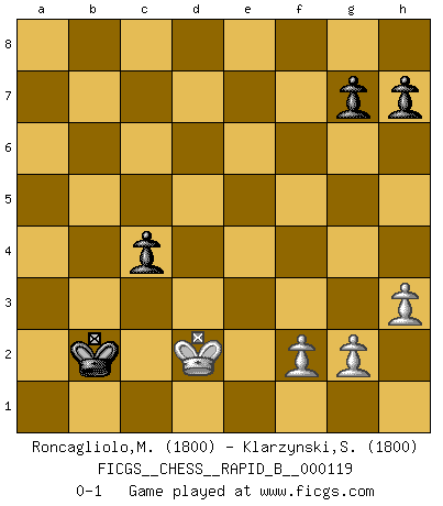 Last move : 0-1 2009 May 27 0:11:52 [Event "FICGS__CHESS__RAPID_B__000119"] [Site "FICGS"] [Date "2009.04.14"] [Round "1"] [White "Roncagliolo,Marco"] [Black "Klarzynski,Slawomir"] [Result "0-1"] [WhiteElo "1800"] [BlackElo "1800"] 1.Nc3 e6 2.e4 d5 3.d4 Bb4 4.e5 c5 5.Nf3 Ne7 6.Bb5+ Bd7 7.Bxd7+ Nxd7 8.O-O O-O 9.Ne2 cxd4 10.Nexd4 Ng6 11.c3 Be7 12.Re1 a6 13.Bd2 Rc8 14.Rc1 Nc5 15.Qe2 Ne4 16.c4 Nxd2 17.Nxd2 Nf4 18.Qe3 Bb4 19.Qxf4 dxc4 20.N4f3 Qd5 21.Red1 Rfd8 22.Qe4 b5 23.Qxd5 exd5 24.Nf1 Bc5 25.Ng3 d4 26.Ne4 d3 27.Ned2 Bb6 28.h3 Rd5 29.Re1 Ba5 30.e6 Re8 31.exf7+ Kxf7 32.Rxe8 Kxe8 33.a4 Kd7 34.axb5 axb5 35.Ra1 Bxd2 36.Nxd2 Re5 37.Kf1 Re2 38.Nf3 Rxb2 39.Ke1 Kc6 40.Rc1 Re2+ 41.Kf1 Kd5 42.Rb1 Kc5 43.Rxb5+ Kxb5 44.Nd4+ Kb4 45.Nxe2 dxe2+ 46.Kxe2 Kb3 47.Kd2 Kb2 0-1 Dunst (Sleipner, Heinrichsen) Opening Kingside Castling by player White (move 8) Kingside Castling by player Black (move 8) 10 pieces endgame at move 45 : White KNPPP , Black KPPPP WHITE : King + 1 Knight 3 Pawns BLACK : King + 4 Pawns 9 pieces endgame at move 45 : White KPPP , Black KPPPP WHITE : King + 3 Pawns BLACK : King + 4 Pawns 8 pieces endgame at move 46 : White KPPP , Black KPPP WHITE : King + 3 Pawns BLACK : King + 3 Pawns Player Black won this chess game. Follow this game move after move (download)Pawns are born free, yet they are everywhere in chains. (Rick Kennedy) Kann Schach nicht schließlich das Nationalspiel der Deutschen werden? Und welche weiteren Ausblicke bieten sich dann dar! Welche Hebung des allgemeinen Kultur-Niveaus, ja der Moral, wenn das Schachbrett den Kartentisch verdrängen würde! Wahrlich, ein Ziel, des Schweißes der Edlen wert! (Siegbert Tarrasch) Los Peones son nacidos libres, y aún así, se encuentran encadenados por todos lados. (Rick Kennedy) Nous sommes les pions de la mystérieuse partie d'Echecs jouée par Dieu. Il nous déplace, nous arrête, nous pousse encore, puis nous lance un à un dans la boîte du Néant. Epitaphe sur la tombe de David Janowsky (1868-1927). I know the human being and fish can coexist peacefully. (George W. Bush, Saginaw sept. 29, 2000)