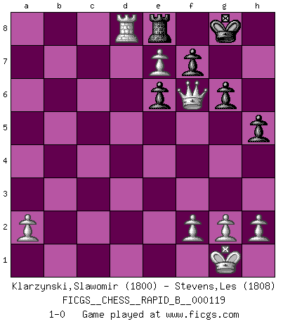 Last move : 1-0 2009 June 13 1:9:3 [Event "FICGS__CHESS__RAPID_B__000119"] [Site "FICGS"] [Date "2009.04.14"] [Round "1"] [White "Klarzynski,Slawomir"] [Black "Stevens,Les"] [Result "1-0"] [WhiteElo "1800"] [BlackElo "1808"] 1.d4 Nf6 2.c4 g6 3.Nc3 d5 4.cxd5 Nxd5 5.e4 Nxc3 6.bxc3 c5 7.Bb5+ Bd7 8.Bxd7+ Qxd7 9.Nf3 Bg7 10.O-O O-O 11.Be3 Nc6 12.d5 Na5 13.Bxc5 Bxc3 14.Rc1 Bg7 15.Bb4 b6 16.Bxa5 bxa5 17.Nd4 Qd6 18.Nc6 Bh6 19.e5 Qd7 20.Rc5 Rac8 21.Rxa5 e6 22.Rxa7 Qe8 23.Re7 Bg7 24.Rxe8 Rfxe8 25.d6 Bxe5 26.Nxe5 Red8 27.Qf3 Rf8 28.Qf6 Rcd8 29.Nc6 Rd7 30.Ne7+ Rxe7 31.dxe7 Re8 32.Rd1 h5 33.Rd8 1-0 King's Indian defense, 3.Nc3 Kingside Castling by player White (move 10) Kingside Castling by player Black (move 10) Player White won this chess game. Follow this game move after move (download)A win by an unsound combination, however showy, fills me with artistic horror. (Wilhelm Steinitz) Kritik überlasse ich den Spießern. Ich zeige nichts, wofür ich mich schämen muss. (Alexandra Kosteniuk) Si un gobernante no entiende al Ajedrez, ¿como puede governar él un reinado?. (El Rey Khusros II) Il vaut mieux sacrifier les pièces de l'adversaire. (Xavier Tartacover) Children in the dark cause accidents, accidents in the dark cause children. (Unknown)