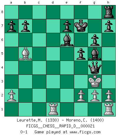 Last move : 0-1 2009 April 28 9:29:55 [Event "FICGS__CHESS__RAPID_D__000021"] [Site "FICGS"] [Date "2009.04.14"] [Round "1"] [White "Leurette,Marc-Antoine"] [Black "Moreno,Ciro"] [Result "0-1"] [WhiteElo "1330"] [BlackElo "1400"] 1.e4 c5 2.Nc3 Nc6 3.Nf3 Nf6 4.d4 cxd4 5.Nxd4 g6 6.Bg5 Bg7 7.Nf3 Nxe4 8.Nxe4 d5 9.Nc3 d4 10.Ne4 f5 11.Nc5 Qa5+ 12.c3 Qxc5 13.cxd4 Nxd4 14.Be3 Nc2+ 15.Ke2 Qb5+ 16.Kd2 Qb4+ 17.Kxc2 Qxb2+ 18.Kd3 Be6 19.Bd4 Rd8 20.Ke3 Bh6+ 21.Ng5 Bxg5+ 22.Kf3 Rxd4 23.Bb5+ Kf7 24.Qxd4 Qxd4 25.Rad1 Qe4+ 26.Kg3 Qg4+ 0-1 Sicilian : Closed, 2...Nc6 Player Black won this chess game. Follow this game move after move (download)The essence of Chess is thinking about what Chess is. (David Bronstein) Ich habe Kasparov in Rente geschickt. (Veselin Topalov) El Ajedrez por encima de todo... ¡es una pelea!. (Emanuel Lasker) Aidez vos pièces, elles vous aideront. (Paul Morphy) If you work for a living, why do you kill yourself working ? (Tuco to a chicken in The Good, The Bad and The Ugly)