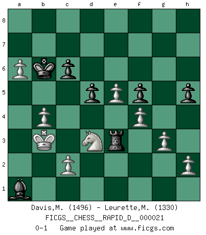 Last move : 0-1 2009 July 12 23:30:58 [Event "FICGS__CHESS__RAPID_D__000021"] [Site "FICGS"] [Date "2009.04.14"] [Round "1"] [White "Davis,Mark"] [Black "Leurette,Marc-Antoine"] [Result "0-1"] [WhiteElo "1496"] [BlackElo "1330"] 1.e4 e5 2.Nf3 Nc6 3.Nc3 Nf6 4.d4 d6 5.dxe5 dxe5 6.Qxd8+ Kxd8 7.Bg5 Be7 8.O-O-O Bd7 9.Bb5 a6 10.Bxc6 bxc6 11.Nxe5 Ke8 12.Bxf6 gxf6 13.Nxd7 Rd8 14.Nxf6+ Bxf6 15.e5 Bg5+ 16.Kb1 Rg8 17.g3 Ke7 18.f4 Bh6 19.Ne4 f5 20.Nc3 Rb8 21.Na4 Rgd8 22.Nc5 a5 23.Na6 Rbc8 24.Nc5 Rd5 25.Nb3 Rcd8 26.Rxd5 cxd5 27.Nxa5 Ke6 28.Nc6 Ra8 29.Rd1 Ra4 30.Nd4+ Ke7 31.Nc6+ Ke6 32.b3 Re4 33.Na7 Bf8 34.Nc6 Bc5 35.a4 Re2 36.Nd8+ Ke7 37.Nb7 Bb6 38.Rh1 c6 39.a5 Ba7 40.b4 h5 41.Nc5 Rf2 42.Nd3 Rf3 43.Kb2 Re3 44.Nc5 Kd8 45.Nd3 Bd4+ 46.Kb3 Kc7 47.a6 Kb6 48.Ra1 Bxa1 0-1 Four knights : Scotch variation Queenside Castling by player White (move 8) Player Black won this chess game. Follow this game move after move (download)I don't believe in psychology. I believe in good moves. (Bobby Fischer) Es liegt in der Natur, vernüftig zu denken und unlogisch zu handeln. (Anatole France) La esencia del Ajedrez es pensar acerca de lo que el Ajedrez es. (David Bronstein) Tout change constamment, y compris dans le monde des Echecs. (Botvinnik) Perhaps chess is the wrong game for the times (The Chess Master and the Computer, by Garry Kasparov - 2010)