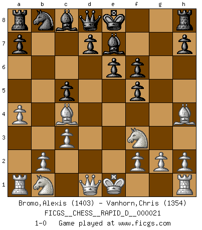 Last move : 1-0 2009 May 26 6:41:19 [Event "FICGS__CHESS__RAPID_D__000021"] [Site "FICGS"] [Date "2009.04.14"] [Round "1"] [White "Bromo,Alexis"] [Black "Vanhorn,Chris"] [Result "1-0"] [WhiteElo "1403"] [BlackElo "1354"] 1.d4 e6 2.e4 Bb4+ 3.c3 Bf8 4.Nf3 f5 5.Bg5 Nf6 6.e5 Be7 7.exf6 gxf6 8.Bh4 b6 9.a4 c5 10.dxc5 bxc5 11.Bc4 1-0 This chess game has been lost on time (started : 2009.04.14 13:55:23) Queen's pawn Player White won this chess game. Follow this game move after move (download)If a ruler does not understand Chess, how can he rule over a kingdom ? (King Khusros II) Pläne sind die Träume des Verständigen. (Ernst Freiherr von Feuchtersleben) Nunca antes ha habido un jugador de Ajedrez con tal conocimiento a fondo de las complejidades del juego y una inmensa voluntad absolutamente indomable de ganar. Yo pienso que Fischer es el jugador mas grande que jamás haya existido. (Lisa Lane) Les échecs c'est le défi de l'alpiniste, toujours plus haut, prêt à tout pour monter à l'assaut du Roi ennemi. Les échecs, c'est de la musique en mouvement, un ballet majestueux pour les yeux. C'est de la poésie composée par les fantômes du passé qui au même titre que Rimbaud ou Verlaine méritent notre admiration. Les échecs, c'est de la peinture ou le moindre mouvement modifie le tableau pour en faire un Picasso ou un Van Gogh. Les échecs, c'est tout et rien, c'est la vie et la mort. Jjulie33 sur le forum de France-Echecs. Optimism is a variety of information deficit. Sometimes especially true for correspondence chess games. (Michael Aigner)