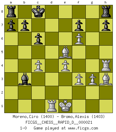 Last move : 1-0 2009 April 30 15:0:46 [Event "FICGS__CHESS__RAPID_D__000021"] [Site "FICGS"] [Date "2009.04.14"] [Round "1"] [White "Moreno,Ciro"] [Black "Bromo,Alexis"] [Result "1-0"] [WhiteElo "1400"] [BlackElo "1403"] 1.c4 e5 2.Nc3 c6 3.g3 Nf6 4.d4 d5 5.dxe5 d4 6.exf6 dxc3 7.Qxd8+ Kxd8 8.bxc3 g6 9.Nf3 Nd7 10.Ng5 Ke8 11.Ne4 Ne5 12.c5 Bf5 13.Nd6+ Bxd6 14.cxd6 Kd7 15.f3 Kxd6 16.e4 Be6 17.Bf4 g5 18.Rd1+ Kc7 19.Bxe5+ Kc8 20.h4 gxh4 21.Rxh4 Bxa2 22.c4 Bb3 23.Bh3+ 1-0 English Opening Player White won this chess game. Follow this game move after move (download)It is peculiar but a fact nevertheless, that gamblers in chess always have enthusiastic followers. (Botvinnik) Der Schachmeister von Heute braucht Courage, einen Killerinstinkt, Ausdauer und Arroganz. (Larry Evans) Un entendimiento a fondo de las continuaciones típicas del mate, hace de las combinaciones de sacrificio mas complicadas conducirlas a ellas no solo sin dificultad, sino casi de una manera natural. (Siegbert Tarrasch) Un journaliste : 'Vous préférez avoir une dame de plus sur l'échiquier ou au lit ?' Boris Spassky : 'Ca dépend de la position.' My poor ole parrot... Is not in the circulation of displays ....poo hoo hoo :) (Wayne Lowrance's enigma)
