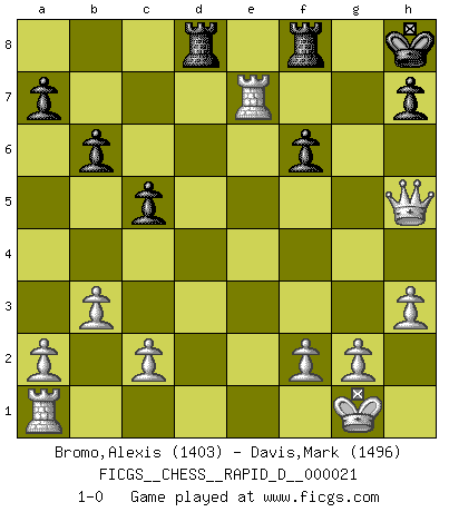 Last move : 1-0 2009 May 6 2:35:1 [Event "FICGS__CHESS__RAPID_D__000021"] [Site "FICGS"] [Date "2009.04.14"] [Round "1"] [White "Bromo,Alexis"] [Black "Davis,Mark"] [Result "1-0"] [WhiteElo "1403"] [BlackElo "1496"] 1.e4 e5 2.Nf3 Nc6 3.Bb5 d6 4.O-O Bd7 5.Bxc6 Bxc6 6.Re1 Nf6 7.Nc3 Be7 8.d4 exd4 9.Nxd4 Bd7 10.Bf4 O-O 11.h3 Re8 12.e5 dxe5 13.Bxe5 c5 14.Ndb5 Bxb5 15.Nxb5 Qb6 16.Nc7 Rad8 17.Qf3 Rf8 18.b3 Nd5 19.Nxd5 Qe6 20.Nxe7+ Qxe7 21.Bxg7 Kxg7 22.Rxe7 b6 23.Qg3+ Kh8 24.Qe5+ f6 25.Qh5 1-0 Ruy Lopez : Old Steinitz defense Kingside Castling by player White (move 4) Kingside Castling by player Black (move 10) Player White won this chess game. Follow this game move after move (download)Chess demands total concentration. (Bobby Fischer) Man braucht nicht immer den besten Zug zu spielen: Ein Zug muß aktiv, unternehmungslustig, korrekt und schön sein. (David Bronstein) El Ajedrez demanda una total concentración. (Bobby Fischer) Toutes les manuvres exécutées sur une colonne ouverte ont pour but ultime l'intrusion définitive sur la septième ou la huitième rangée, en plein cur de la position ennemie. (Aaron Nimzovitch) Shallow men believe in luck. Strong men belive in cause and effect. (Ralph Waldo Emerson)