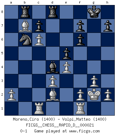 Last move : 0-1 2009 July 17 11:2:59 [Event "FICGS__CHESS__RAPID_D__000021"] [Site "FICGS"] [Date "2009.04.14"] [Round "1"] [White "Moreno,Ciro"] [Black "Volpi,Matteo"] [Result "0-1"] [WhiteElo "1400"] [BlackElo "1400"] 1.c4 e5 2.Nc3 Nc6 3.d3 Nf6 4.Nf3 Bb4 5.g3 d5 6.cxd5 Nxd5 7.Bd2 Bg4 8.Bg2 Nxc3 9.bxc3 Ba5 10.Qa4 Bxf3 11.Bxf3 Qf6 12.O-O Bb6 13.c4 O-O 14.Rac1 Bd4 15.c5 Ne7 16.Bxb7 Rab8 17.Qxa7 Nc6 18.Qa6 Ne7 19.Qxf6 gxf6 20.c6 Nd5 21.e4 Nb6 22.Kg2 Rfd8 0-1 This chess game has been lost on time (started : 2009.04.14 13:55:23) English : Sicilian Reversed Kingside Castling by player White (move 12) Kingside Castling by player Black (move 13) Player Black won this chess game. Follow this game move after move (download)Combinations have always been the most intriguing aspect of Chess. The masters look for them, the public applauds them, the critics praise them. It is because combinations are possible that Chess is more than a lifeless mathematical exercise. They are the poetry of the game; they are to Chess what melody is to music. They represent the triumph of mind over matter. (Reuben Fine) Oft bringt ein stiller Zug das Erdbeben. (Richard Reti) La belleza de un movimiento no se refleja solo en su apariencia, sino en el pensamiento detrás de él. (Siegbert Tarrasch) Soyez une menace à chaque fois que vous vous asseyez pour jouer. (Ken Smith) Every man's memory is his private literature. (Aldous Huxley)