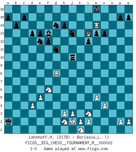Last move : 1-0 2009 September 28 20:45:23 [Event "FICGS__BIG_CHESS__TOURNAMENT_M__000002"] [Site "FICGS"] [Date "2009.04.14"] [Round "1"] [White "Lehnhoff,Heinz-Georg"] [Black "Borisovs,Leonids"] [Result "1-0"] [WhiteElo "2178"] [BlackElo ""] 1.j2-k4 d15-d13 2.h1-o7 h15-g13 3.o7-o15 p16-o14 4.o15-c4 b16-c14 5.m2-m4 k15-k13 6.e2-e4 n15-n13 7.d2-d4 m15-m13 8.n2-n4 l15-l13 9.l1-p5 g13-j12 10.o1-g8 l13-l12 11.m1-m3 e15-e13 12.c4-c7 o16-l13 13.c1-l9 g15-g13 14.f1-b5 l13-k14 15.c7-d6 k14-l13 16.d6-f6 q16-n16 17.e1-e3 f16-b12 18.g1-j2 f15-f13 19.g8-f9 l16-m15 20.b1-c3 j15-h13 21.m3-k3 l13-m12 22.f6-b6 f13-f12 23.e4-e5 g16-f14 24.p1-o3 n16-o16 25.m4-m5 m12-k14 26.b6-p6 j12-g11 27.f9-e8 o16-o15 28.k4-l6 f14-e12 29.q1-m1 m15-o13 30.m1-m4 b12-c13 31.m4-j4 j16-k15 32.c3-d5 o13-c2 33.a1-c1 c2-p14 34.d5-f6 c13-o2 35.l6-m4 k14-q8 36.j2-l3 h16-o10 37.p6-n8 q8-m4 38.o3-m4 o10-f2 39.c1-f1 f2-b2 40.e8-k13 j14-k13 41.b5-k13 o2-m4 42.k13-n16 k15-l16 43.n16-o15 p14-o15 44.j4-m4 k16-l14 45.m4-k4 c16-f13 46.k4-k15 e16-e15 47.k15-k4 l16-l15 48.l9-h12 g13-h12 49.p5-h12 l15-m14 50.h12-e15 c14-e15 51.k4-k15 e15-g14 52.k15-o15 m16-m15 53.o15-m15 o14-m15 54.e3-e4 b2-g2 55.e4-k4 m15-l13 56.j1-j2 a16-j16 57.f1-b1 b15-b14 58.b1-b8 j16-j10 59.b8-g8 g2-a2 60.n8-o8 l14-j13 61.o8-o16 m14-l14 62.o16-l16 l14-m14 63.k4-k14 h13-k14 64.k3-k14 m14-n15 65.l16-l13 n15-n16 66.k14-n14 n16-m16 67.n14-m14 1-0 Follow this game move after move (download)Everything is in a state of flux, and this includes the world of Chess. (Mikhail Botvinnik) Die starken Figuren des Gegners muss man abtauschen. (José Raúl Capablanca) El Ajedrez demanda una total concentración. (Bobby Fischer) Tout change constamment, y compris dans le monde des Echecs. (Botvinnik) Faith : not wanting to know what is true. (Friedrich Nietzsche)