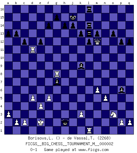 Last move : 0-1 2009 September 20 7:59:23 [Event "FICGS__BIG_CHESS__TOURNAMENT_M__000002"] [Site "FICGS"] [Date "2009.04.14"] [Round "1"] [White "Borisovs,Leonids"] [Black "de Vassal,Thibault"] [Result "0-1"] [WhiteElo ""] [BlackElo "2268"] 1.n2-n4 j15-h13 2.m2-m4 h16-o10 3.h3-h4 o10-o2 4.p1-o3 o2-l2 5.k1-l3 l2-c10 6.b1-c3 k16-l14 7.g2-g4 n15-n13 8.f1-j4 c10-f10 9.f2-f3 m15-m13 10.d2-d4 l16-o13 11.e2-e4 o13-n12 12.j2-k4 e15-e13 13.l3-k5 g16-f14 14.c1-j7 f10-b6 15.g1-e2 o15-o13 16.a1-b1 d15-d13 17.l1-n3 c15-c13 18.o1-m3 b16-c14 19.m4-m5 c13-c12 20.j7-e3 p16-o14 21.e2-f4 o16-j11 22.m1-l1 p15-p13 23.h1-g1 p13-p12 24.d4-d5 b6-p6 25.l1-l2 f16-b12 26.k4-l6 a15-a13 27.g1-f1 c14-d12 28.q1-m1 h15-j13 29.n4-n5 p6-j12 30.f1-a6 l14-m12 31.l6-j5 l15-l13 32.m1-l1 l13-l12 33.f4-g6 c16-g12 34.a6-d3 j16-j15 35.j1-j2 d12-f11 36.h2-k3 h13-f12 37.a2-a3 f14-h13 38.g4-g5 j12-g10 39.m5-m6 o14-m15 40.g6-h8 g10-a10 41.j4-h3 a10-f10 42.f3-f4 j11-g9 43.j5-k7 h13-j11 44.n3-l5 m15-l13 45.f4-f5 l13-k11 46.e3-d4 f11-h10 47.h8-g6 q15-q13 48.l5-g9 f10-g9 49.d4-h8 g9-m9 50.m3-n4 g12-f11 51.k3-j5 q13-q12 52.k5-l7 m9-q5 53.d3-d4 b15-b13 54.h3-l6 f11-d9 55.k2-k3 a16-a14 56.k7-j9 q5-q9 57.j9-k11 j13-k11 58.l6-d13 f12-d13 59.n4-d13 f15-f14 60.d13-m5 q9-p10 61.m5-l6 p10-j10 62.l2-l5 m16-m14 63.l5-k5 q16-l16 64.l6-n8 a14-d14 65.h8-m12 n13-m12 66.c3-e2 j10-f13 67.e2-f4 f13-b9 68.j2-k2 d9-e10 69.k5-k8 e16-d16 70.g6-f8 e10-f11 71.j5-h7 j11-h9 72.f8-h9 f11-h9 73.h7-j9 l16-l13 74.j9-k11 h10-k11 75.n8-k11 h9-k11 76.d4-m12 m14-l14 77.l7-j6 d14-d11 78.l1-l11 e13-e12 79.e1-l1 d16-l16 80.l1-l9 b9-b6 81.b1-l1 b6-f2 82.k2-k1 k11-p6 83.k1-j1 f2-f4 84.j1-j2 f4-g4 85.j2-h2 g4-j6 86.h2-g3 j6-j3 87.g3-f4 j3-h4 88.f4-f3 b12-g7 89.l9-k9 k15-k13 90.k8-g8 h4-j3 91.f3-f4 j3-h4 92.f4-e3 h4-g5 93.e3-d3 g5-g3 94.d3-e2 n12-k9 95.l11-d11 g3-h2 0-1 Follow this game move after move (download)The Chess pieces are the block alphabet which shapes thoughts; and these thoughts, although making a visual design on the chessboard, express their beauty abstractly, like a poem. (Marcel Duchamp) Warum muß ich gegen diesen IDIOTEN verlieren? (Aaron Nimzowitsch) El tablero es el mundo, las piezas es el fenomeno del universo, las reglas del juego son lo que llamamos leyes de la naturaleza y el jugador del lado opuesto, se encuentra oculto a nuestra vista. (Thomas Huxley) Les échecs, c'est la lutte contre l'erreur. (Johannes Zukertort) I don't believe in psychology. I believe in good moves. (Bobby Fischer)