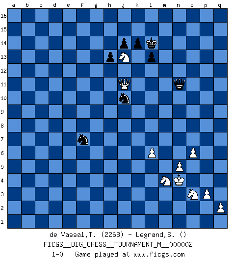 Last move : 1-0 2010 March 28 10:42:41 [Event "FICGS__BIG_CHESS__TOURNAMENT_M__000002"] [Site "FICGS"] [Date "2009.04.14"] [Round "1"] [White "de Vassal,Thibault"] [Black "Legrand,Stephane"] [Result "1-0"] [WhiteElo "2268"] [BlackElo ""] 1.j2-h4 p16-o14 2.h1-l4 j15-k13 3.l4-c12 h15-g13 4.c12-c15 b16-c14 5.c15-m6 m15-m13 6.o2-o4 h16-l13 7.k1-l3 e15-e13 8.n2-n4 d15-d13 9.m2-m4 f16-b12 10.h2-j4 n15-n13 11.g1-f3 m13-m12 12.e2-e4 l16-q11 13.p1-o3 q11-j4 14.h3-j4 b12-l3 15.k2-l3 l13-l3 16.j1-k1 m16-m13 17.l1-k2 l3-g7 18.o1-j6 k13-l11 19.m1-m3 c16-h11 20.f3-h2 m13-k13 21.m3-k3 a16-c16 22.k3-k13 l11-k13 23.b1-c3 g7-f8 24.f2-f3 o16-h10 25.m6-o6 c14-d12 26.h2-g4 c16-c9 27.d2-d3 c9-k9 28.c1-h6 f8-p8 29.h6-k4 h10-j11 30.o6-n5 q16-m16 31.p2-p3 m16-m13 32.l2-l4 k13-l11 33.f1-e2 j11-m8 34.g2-g3 k9-n9 35.n5-m5 h11-n6 36.m5-d13 n6-f13 37.o3-m2 f13-e12 38.d13-a13 m13-j13 39.j6-k5 n13-n12 40.m4-m5 j13-q13 41.n4-n5 n9-b9 42.a1-b1 e12-g14 43.k1-j2 a15-a14 44.m2-o3 g14-e12 45.e1-m1 g16-f14 46.g4-j5 q13-q7 47.c3-d5 m8-k10 48.b2-b3 p8-c8 49.j2-k3 c8-c2 50.d5-f4 c2-c16 51.b1-c1 c16-g12 52.f4-g6 g12-g9 53.k2-m4 g9-q9 54.a13-a5 b9-a9 55.a5-d2 l11-m9 56.h4-j6 m9-n7 57.k5-l6 n7-l6 58.j5-l6 a9-a3 59.f3-f4 q7-a7 60.c1-c2 q9-a9 61.m1-c1 a3-a2 62.c2-a2 a7-a2 63.c1-c2 a2-c2 64.d2-c2 a9-k9 65.e2-h5 e16-c16 66.c2-d1 k9-b9 67.g6-e5 c16-c3 68.h5-f7 e12-h9 69.f7-c4 h9-c4 70.b3-c4 c3-b3 71.j6-h4 b9-b6 72.d1-g1 b6-a5 73.m4-j1 g13-f11 74.j1-h2 f11-g9 75.q1-h1 g9-h7 76.g1-d1 b3-b7 77.d1-g4 g15-g14 78.g4-e6 a5-f10 79.l6-m4 d12-c14 80.e6-o15 k10-h8 81.h2-j1 h7-k6 82.h4-k5 f10-l10 83.k5-m6 l10-j8 84.j4-j5 k6-m5 85.o15-g8 m5-k4 86.h1-h8 j8-j5 87.j1-l3 j5-n9 88.l3-k4 b7-b2 89.m6-k5 f14-h13 90.k5-h4 n9-n10 91.g8-c12 n10-d1 92.k3-j4 d1-f1 93.j4-j5 f1-m7 94.h8-h6 m7-g7 95.h4-f5 g7-l7 96.j5-j4 l7-m7 97.j4-k3 m7-f1 98.c12-f15 f1-m1 99.k3-l3 m1-c10 100.h6-k6 h13-k14 101.f15-g15 c10-c9 102.k6-d6 k16-h15 103.g15-g14 j16-j15 104.d6-p6 p15-p14 105.p6-o6 k14-m13 106.g14-j12 m12-m11 107.k4-g7 c9-k9 108.g7-o14 m13-o14 109.j12-m12 h15-k14 110.m12-o14 k9-k2 111.l3-m3 k2-j3 112.m3-n4 j3-j8 113.n4-o5 j8-l8 114.o6-n6 b2-b7 115.o5-n4 l8-j8 116.n6-l6 b7-l7 117.o14-o6 j8-k7 118.n4-n3 l15-l13 119.l4-l5 l7-l6 120.o6-l6 k7-k12 121.l6-q11 q15-q13 122.q11-p10 k12-l12 123.l5-l6 n12-n11 124.p10-p14 q13-q12 125.p14-p9 n11-n10 126.p9-b9 c14-b12 127.b9-g14 k14-h15 128.o4-o5 l12-k12 129.g14-g10 e13-e12 130.g10-g15 b15-b13 131.g15-c11 b12-d11 132.c11-a11 b13-b12 133.a11-a14 m11-m10 134.a14-a8 m10-m9 135.a8-m8 h15-g13 136.f5-g7 k12-g9 137.m8-l7 m9-m8 138.l7-j5 n10-n9 139.g7-h5 g9-k12 140.h5-k6 k12-k9 141.k6-m7 k9-g9 142.j5-k6 g9-j9 143.n3-n4 g13-f11 144.k6-k8 j9-g9 145.k8-l9 g9-g3 146.l9-e15 j15-k14 147.e15-e12 d11-e9 148.e12-b12 g3-f4 149.e5-g6 f4-g3 150.g6-j7 n9-n8 151.m7-o6 n8-n7 152.o6-m7 g3-d3 153.b12-q12 d3-e4 154.q12-m8 n7-n6 155.o5-o6 e4-c4 156.m8-m14 k14-k13 157.m14-m15 k13-k14 158.m15-m16 k14-j15 159.m16-n15 c4-c5 160.n15-n6 f11-g9 161.n6-n7 e9-f7 162.n7-j11 j15-k14 163.j7-k9 c5-g1 164.k9-l11 g1-p9 165.l11-j12 k14-l14 166.m7-l9 h14-h13 167.j12-l11 p9-n11 168.l9-k11 k15-k14 169.l11-j10 g9-j10 170.k11-j13 1-0 Comment by player 1 : Thibault de Vassal : Merci pour la partie! Je ne sais pas si le résultat est bien mérité tant tes attaques tout le long étaient ambitieuses et surprenantes... Follow this game move after move (download)There is no remorse like the remorse of Chess. (H. G. Wells) Das Schachspiel ist ein See, in welchem eine Mücke baden und ein Elefant ertrinken kann. (Emanuel Lasker) No hay otro maestro que tenga una voluntad terrÃfica de ganar. Al tablero, el irradÃa peligro y aún los oponentes mas fuertes tienden a congelarse como liebres cuando olfatean a una pantera. Aún sus debilidades son peligrosas. Con las blancas, su juego de apertura es predecible - te es posible hacer planes en su contra - pero es tan fuerte que tus planes casi nunca funcionan. En el juego medio, su precisión e invención son fabulosas y en finales, tú simplemente no le puedes vencer. (Experto Alemán anónimo) Le pion, dans sa simplicité, marche droit devant lui, mais lorsqu'il prend, il le fait obliquement? Ainsi l'homme, tant qu'il reste pauvre, marche dans la droiture et vit honnêtement, mais lorsqu'il recherche les honneurs, il flatte, se parjure et, par les voies obliques, cherche une position supérieure sur l'échiquier du monde. (Jean de Galles) You know what they say : You lie down with the Devil, you wake up in Hell. (Horatio Caine, C.S.I. Miami)